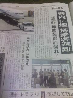 最近、ブログをさぼり気味です。と、いうか完全にさぼっています。実は、裏でよからぬ事をやっているんだけど・・・・それは後日のお楽しみ。(*^^*)さて、東京在中の友人が帰省していました。出張途中、土日で帰省していたらしい。日曜日にはさっそく東京へとんぼ返りところが、松山空港で足止めになったらしい原因はこれ↓友人によると、飛行機に乗り込もうとしたら煙がもくもくと発生したという。新聞を読んでいると飛行機の欠航のニュースがめずらしくない。特に、高知空港で胴体着陸した機体は以前からトラブルのニュースがとても多い。私自身も伊丹空港で大変な目に遭った事がある。朝一番の飛行機に乗りたかったのにトラブルで飛ばず便が少ないので代替えは夕方4時になるという事だった。飛行機・・・早くて便利だけど便数とかメンテナンス無理してないかい?事故だけは勘弁しておくれ・・・・