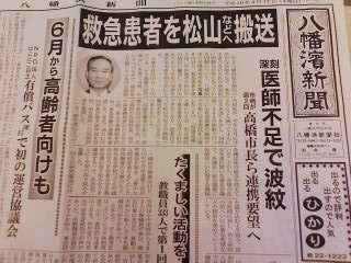 昨日の市内のローカル新聞です。紙面によると、深刻な医師不足の影響で、市立病院の24時間救急体制が不可能となり、毎週水曜・土曜は救急患者を他の市の病院へ搬送するとのこと・・・・・(°◇°)~ガーン状況はここまできていたのか。先日の、しんのすけ事件もあるし実はブログには書いていないが、私自身、年に一度の検診があるのだが、先日、申し込みをしたところ、断られてしまった。(T_T)市内の医療がかなり苦しい事になってきている。自分の身は自分で守らねばならんのだが交通事故はどうする?まったく怖い世の中になったものだ。