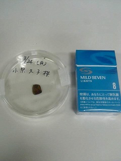 実は今、実母が胆石で入院しています。開腹手術ではなく、胃カメラの先に泡立て器のような物がついた内視鏡により、内側から取り出しているそうです。一個一個、胆石を慎重に取り出しているそうです。取り出した胆石はそのまま腸の中に落とすらしいのですが1個だけ外に取り出してくれました。それが、コレ写真では平面的に見えるんだけど、実は立体。おおよそ、サイコロくらいの大きさがある。実は、母の入院が長引いている原因の一つが数の多さなのである。このサイコロくらいの胆石がなんと、100個ほどあるらしいのだ。実母ながら、よくぞここまでため込んだものだと感心するやら、心配になるやら・・・・すでに、内視鏡によって20個ほど、取り除いたらしいのだがそれでも、やっと1/5はて、さて、いつまでかかるのやらヤレヤレ ┐(´-`)┌ マイッタネ それにしても、昔は開腹しないとできなかった手術が内視鏡によって行われるようになった。医学の進歩ってスゴイな。(゜O゜;