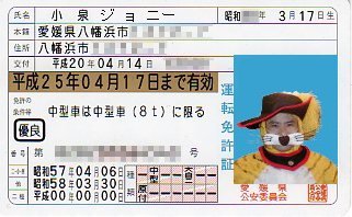 本日、運転免許の更新に行ってきました。σ(^_^;ワタシ?普段から清く正しく美しい私はもちろん、ゴールド免許に決まってるじゃないですか。唯一不安のあった視力もなんなくOK!(ブルーベリー食べてて良かった。(^。^;)フウ)と、いうわけでま新しい免許になりましたよ。それにしても4輪自動車の欄が普通→中型車(8t)に限るになっている。なんじゃこりゃ・・・なんか、限定されているようでカッコ悪いなぁ・・・・それにしても、知らん間に道路交通法が変わっている。武力攻撃事態における交通規制について・・・・なんて項目ができている。(>_