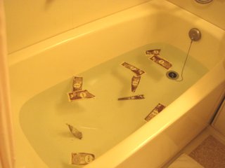 あ~あ、今までよく働いたなぁ・・・働き過ぎて、儲かって、儲かって、しょうがないなぁ・・・ヾ(@^▽^@)ノわはは現金もあふれちゃって、もうしまう場所がない。しょうがない!風呂にでも入れちゃぇ!ああ、お札のお風呂は暖まるなぁ。ちょうどお札がお湯の温度を逃がさない働きをしてくれるのでお湯がなかなか冷めないのだ。みんな、お札のお風呂、いいよ。やってみない?・・・・・・・・・・・・・・・・・・・・・・・・・・・・と、いうのは真っ赤なウソ!ほんとは、これ入浴剤なんです。でも、手に持っているだけで自然と顔がほころんでしまいます。思わずにやけてしまいます。それを湯船に浮かべて入浴するわけです。・・・・すると札束が溶けて、泡になり文字通り泡風呂と化します。ああ、いい気持ち・・・・・ババンババンバンバン!・・・・・・・・・・・と、なるハズなのだが、虚しいのはなぜ?入浴剤が泡と化すのは正常なのだが札束が泡と化すのは大人のジョークだ。所詮札束は紙切れ大事なのは人間関係だなぁ・・・・しっかし、誰だ、こんなの考えたヤツは(・_・")?画像協力:雪虫さんありがとう。(^0^)