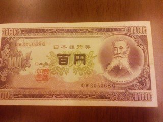 妻の実家を捜索中(なんでやねん)こんな物が発見された。その時にいた、20歳代の甥はこんなもの見たことも聞いたこともない。と、言った。かく言う私も、このお札が流通していた記憶はない。私の記憶にある古いお金といえば大きい、50円硬貨。現在の50円硬貨は現在の100円硬貨よりちょっぴり小さいが昔の50円玉は現在の100円硬貨より一回り大きかった。もちろん穴も開いていた。しかしぃ、この100円紙幣は知らんなぁ・・・見たことも、使った事もないなぁ・・・・この辺の記憶の有無で年がわかるかもしれないなぁ。皆さん、このお札知ってます?ちなみに、古銭としての価値はあんまりないそうです。もちろん、日本銀行券として100円の価値はありますが・・・大量に入手してお店のお釣りに使ったらウケるかも。(^◇^;)プレスリリースネタになるかも。誰かやらない?
