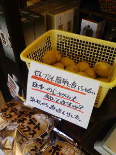 そこの、奥さん!イイのが入ったよ。なんと、日本一のじゃがいもだぁ!じゃがいもも、日本全国いろいろあるけどね。静岡の三方原って知ってる?えっ? 知らないの?昔ね、徳川家康と武田信玄が合戦した場所なんだよ。そこはね、今は日本一のじゃがいもの産地なんだよ。北海道産よりもほくほくしておいしいと、特に、レストランのシェフに人気があるんだよ。このじゃがいもって生でかじっても甘いんだ。果物並に糖度があるんよ。スゲーよ。でもね、このじゃがいも、めちゃくちゃおいしいけど、ちょっと繊細。皮が薄いので、段ボールに入れてトラックで運ぶだけでジャガイモ同士がこすれ合ってだめになっちゃう。だから、遠くへ運べないんだ。もちろん、スーパーにも絶対に並ばないよ。これだけのじゃがいもは、あんまり味付けしちゃもったいないね。ふかして、塩とかバターで食べると最高だね。口の中でじわ~と、旨味が広がって、もうたまらんよ。テレビに出ているようなセレブでもこんなじゃがいも食べられないよ。だって、知らないからね。しかも、買えないからね。おっと、もう、これだけになっちゃった。もうすぐ、なくなっちゃうけど、奥さん、どうする?もう、二度と手に入らないかも?えっ? 私?私はただの酒屋ですけど?何か?