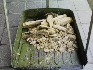 ちりとりにごっそり入った謎の物体。さて、これって何でしょう?・・・・・・・・・・・・・・・実はね、これ、台所の配水管に詰まっていた油の固まりなんです。油と言っても、石けんのような感じ。実は、数日前から台所の水が流れなくなってしまったのです。しょうがないので配管の途中からワイヤーを差し込んで掃除をしていたのですが・・・・・・途中詰まっているところが堅くてワイヤーが入らない。しかも、詰まっている配管は地中に埋まっていて手が出せない。ってな事で、往生していたらお隣さんが、高圧洗浄機なるものを借りてきてくれました。高圧洗浄機と言ってもジャパネットたかたで売ってるような家庭用ではありません。ガソリンエンジンで水を高圧噴射するプロ用ちょっとした冷蔵庫ほどの大きさがあります。さっそく、これを使って配管を洗浄すると・・・・・・・・・・・・・・( ̄□ ̄;)!!でるわ、でるわ・・・・・・・缶コーヒーほどの径しかない配管から恐ろしいほどの油の固まりが・・・・・・半分ほどは下水に流れていったので写真に写っているのは半分以下・・・・・正直、この配管は油の固まりで完全に詰まっていたのでした。それにしても、排水管なんて普段気にもとめないんだけど詰まると大変です。お隣さん、感謝、感謝です。m(_ _)m