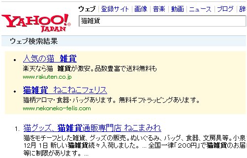 インターネットの検索ページgoogleとかいろいろあるけど、日本ではほぼ7割の方が「Yahoo!」を使っていらっしゃいます。つまり、日本ではYahoo!を抜きにインターネットビジネスは語れません。そんなYahoo!の検索窓で「猫雑貨」で検索するとついに、「ねこまみれ」が一位になっていました。おお、ばんざ~い \(^o^)/ばんざ~い \(^o^)/ばんざ~い \(^o^)/ばんざ~い \(^o^)/ばんざ~い \(^o^)/思えば、コツコツとSEOやってきた成果かな?セコイ技を使って、1000位圏外に抹殺されかけた事もありました。まあ、とにかく、日本一ってのはスゴイ!皆様、これからもよろしくお願いします。m(_ _)m