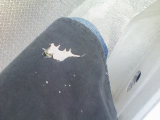 配達中、バイクで走っていると突然、目の前に何か・・・・・未確認の物体が・・・・落下してきた。ピチャ・・・・・何か、嫌な音と、嫌な感触。(゜ロ゜)ギョェエプロンをしていたので直撃は避けられたのだが私の足には、謎の物体Xがしがみついていた。Y(>_