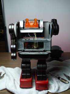 先日、手に入れた1960年代のブリキロボット名前を「スーパージャイアントロボ」と呼ぶそうです。かっこいいじゃないか・・・・・ 残念ながら壊れていますので、とりあえず分解してみよう。まず、頭と、胸板をはぎ取ります。胸のマシンガンがさっそうと登場しました。 さらに、マシンガンも取り除く。じゃじゃーん、本邦初公開。これが、ブリキロボットの心臓部だ。どうやらモーターは生きているようです。(^。^;)フウ モーター駆動でギアを介して左側の2枚ギヤに動力が伝えられる。左側に2枚のギアにはカムとバネが絶妙に配置されていて、回転しながらあるタイミングによって上下に動作するのである。カムの働きで上方向に動力が移動するとその動きは変形カムギヤに伝えられ、これがマシンガンを動かすのだ。残念ながらカムギヤが破損している。これはペンチで修正。 下方向に伝えられた動力は下半身のギヤに伝えられる。 ・・・・・と、思ったら・・・・・\(>o<)/ギャー!プラスティック製のウオームギヤが破損しているぅ・・・・・こんなの補修部品なんて手に入らないかも・・・・・ とか、思っていたら。良い時代になったものです。今時の強力な接着剤はいとも簡単に破損がなおりました。こういう大事なところは、金属製のベベルギヤにしてもらいたいものだ。(`へ´)プンプンって、このおもちゃも50年近く前のもの。よく保ってると思うよ。それにしても、ブリキのおもちゃは良くできている。最近はスイス製の手巻きのゼンマイ時計(ロレックスとかね)の人気が高いが次元は違うが同じ世界の匂いを感じる。なんというか、職人の魂が入っているってカンジかなぁ。 さて、駆動系の錆をとって油をさして・・・・・ひょっとして・・・・なおったかも!(^◇^;) 結果が知りたい方は↓こちらをご覧下さい。http://www.youtube.com/watch?v=nimShoow-fs