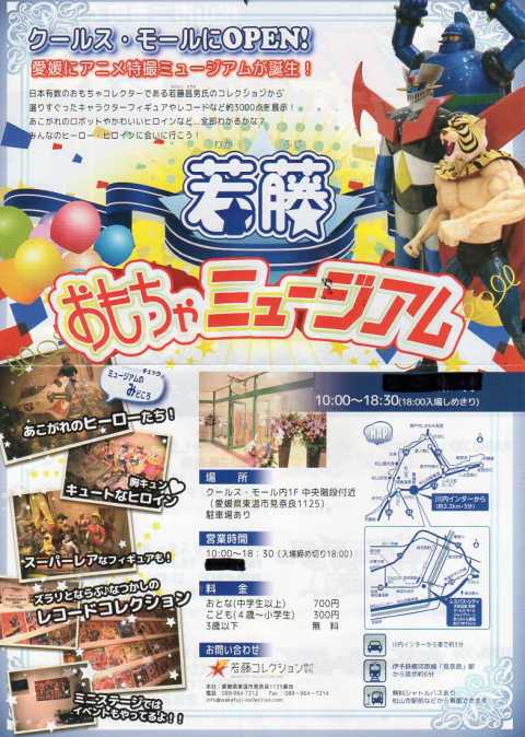 松山郊外のショッピングモールにちょっと変わったミュージアムがあります。それは若藤おもちゃミュージアム日本有数のおもちゃコレクターの若藤氏の個人的な収集品の一部を展示しているというものです。今まで存在自体は知っていたのですがなんとなく行く機会がありませんでした。今回、機会がありましたのでちょっくら行ってきましたよ。場所は東温市のクールスモールそちらのテナントとして入っているようです。・・・・・・・・・・・まぁ、圧巻ですな。どーやってこんなもの集めたの????細かい話は割愛しますがもはや個人レベルを遥かに超えている感があります。展示品も1950年代のおもちゃから、つい最近まで買えたようなものまで多岐にわたります。中には何でも鑑定団に出したらすさまじい価格が付くのは間違いないと素人でも思うようなおもちゃが多々あります。いやぁ、良い物見せてもらいました。ただ、ちょっと残念な点もあります。展示スペースがショッピングモールのテナント店舗のスペースなので陳列台のような場所に展示物が押し込まれています。解説も必要最低限しかありません。なので、分かる人にはわかるのですが普通の人には「どう凄いのか?」がおそらくわからないでしょう。理想を言えば、博物館のような規模で余裕のあるスペースで展示して展示物1つ1つに対して説明文があればもっともっと楽しめるでしょう。それが東京のような大都市圏にあれば完璧ですね。世界中から人の訪れるミュージアムになりそうな予感。展示物はすばらしいのですがちょっと残念感のあるミュージアムでした。そういえば、私は子供の頃に超合金のマジンガーZを持っていたハズですがどこにいったのだろう????あれば、そこそこ値が付きそうなのに・・・・・(^_^;)