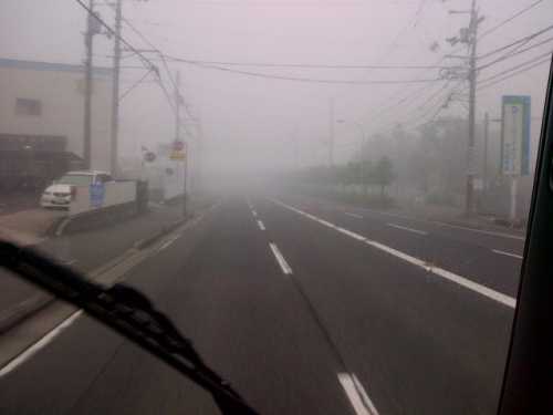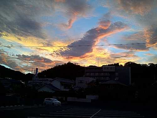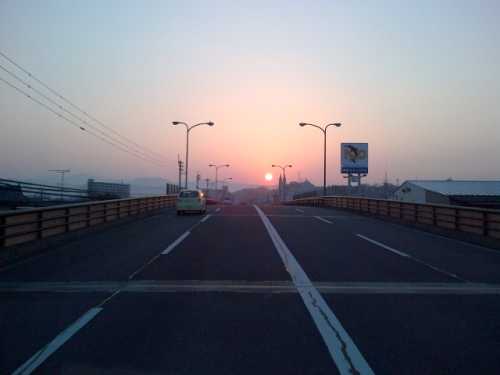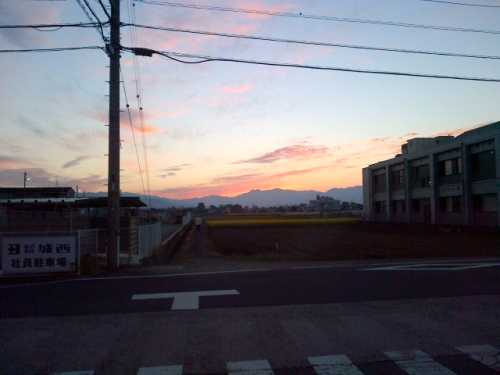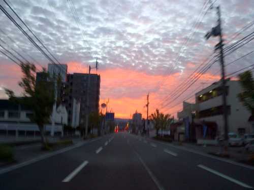 夕焼けのようだが実は朝焼け 雲がフィルターとなって光量を抑えているので太陽が丸く見える。
