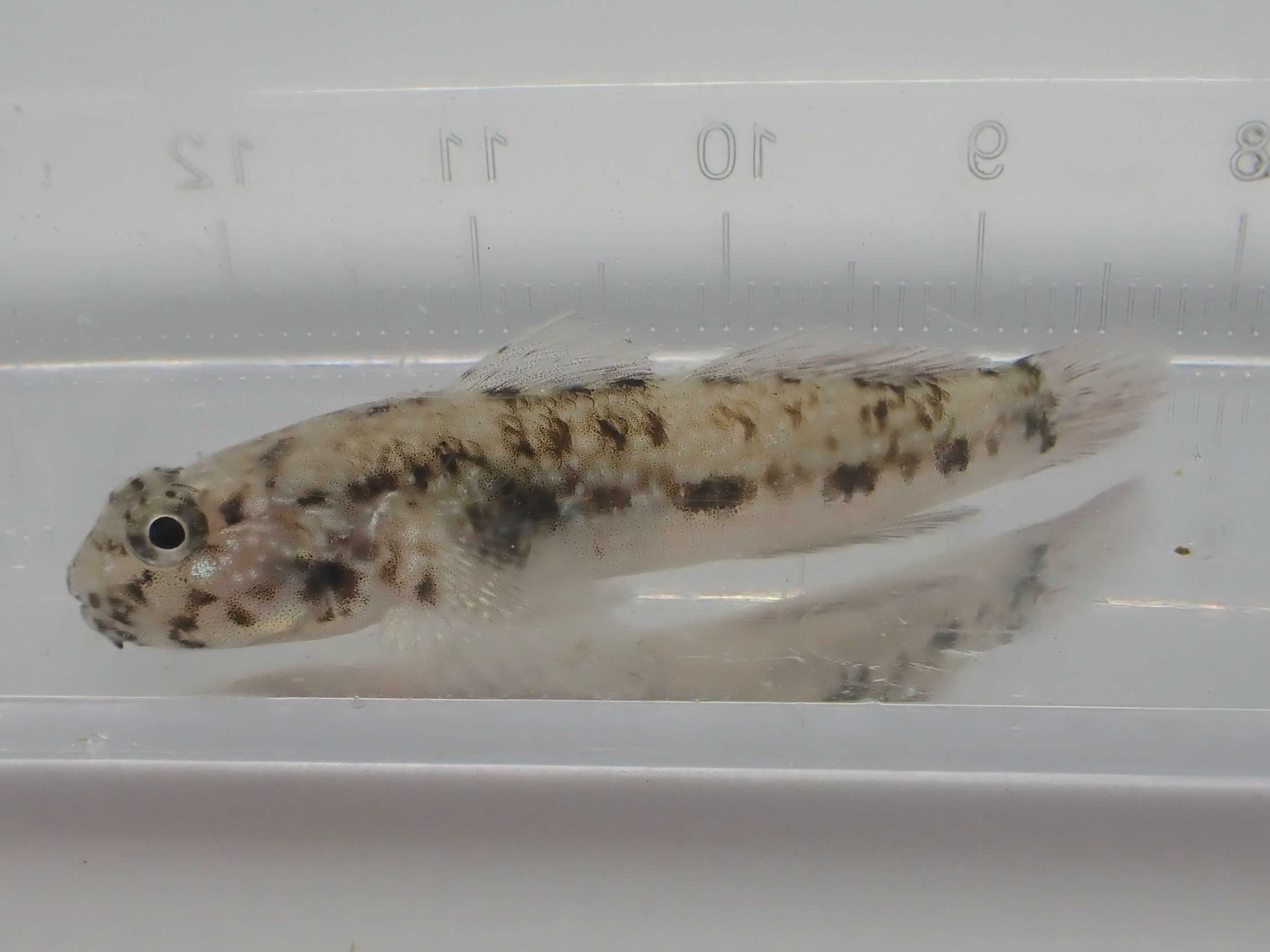 朝活にて初採集。上から見てクモハゼともヒメハゼともつかないなんとも微妙なハゼを発見したのでキープ(横から見るといかにもクモハゼらしい)。持ち帰り細部を見てスジクモハゼと同定。
