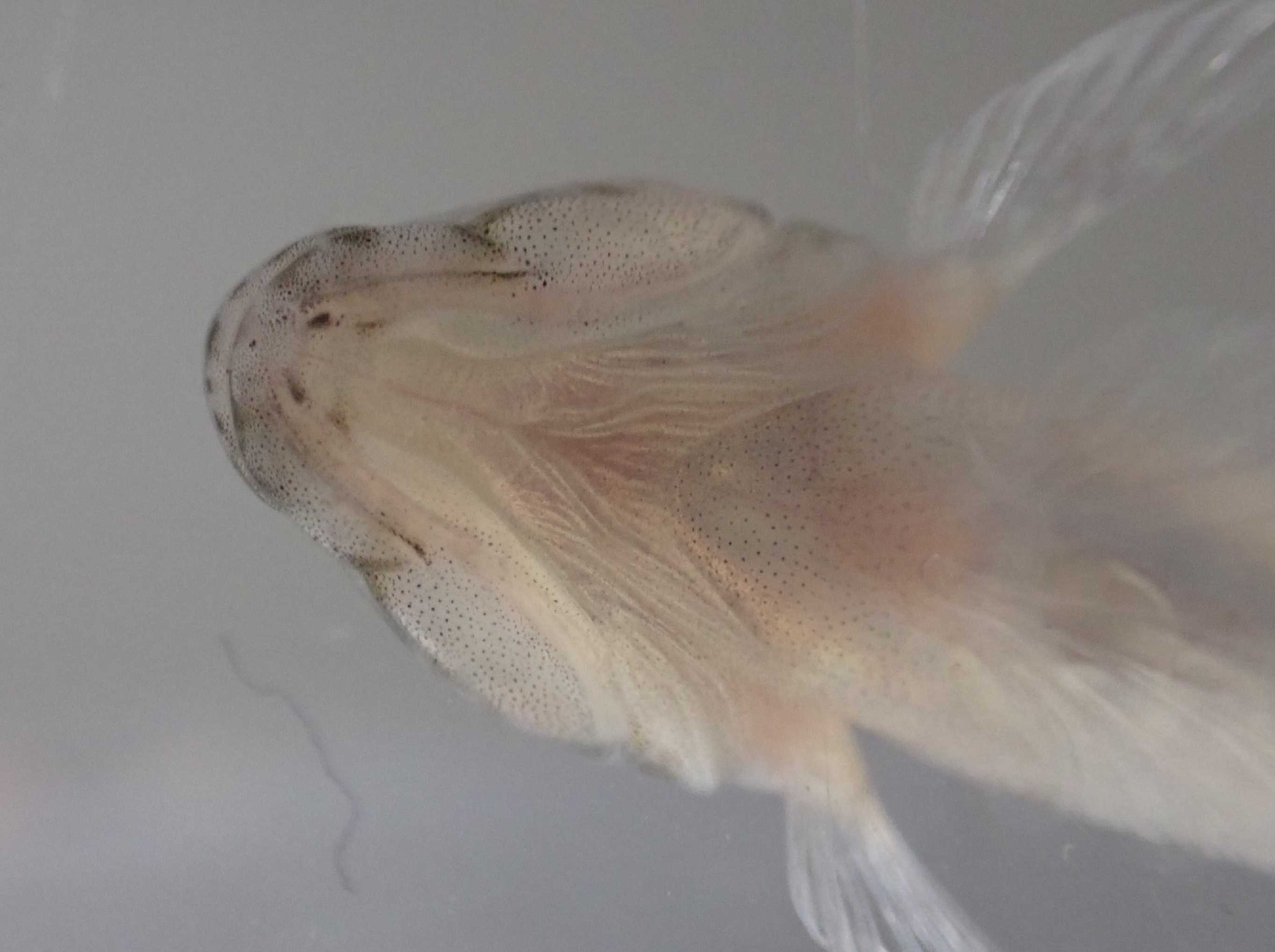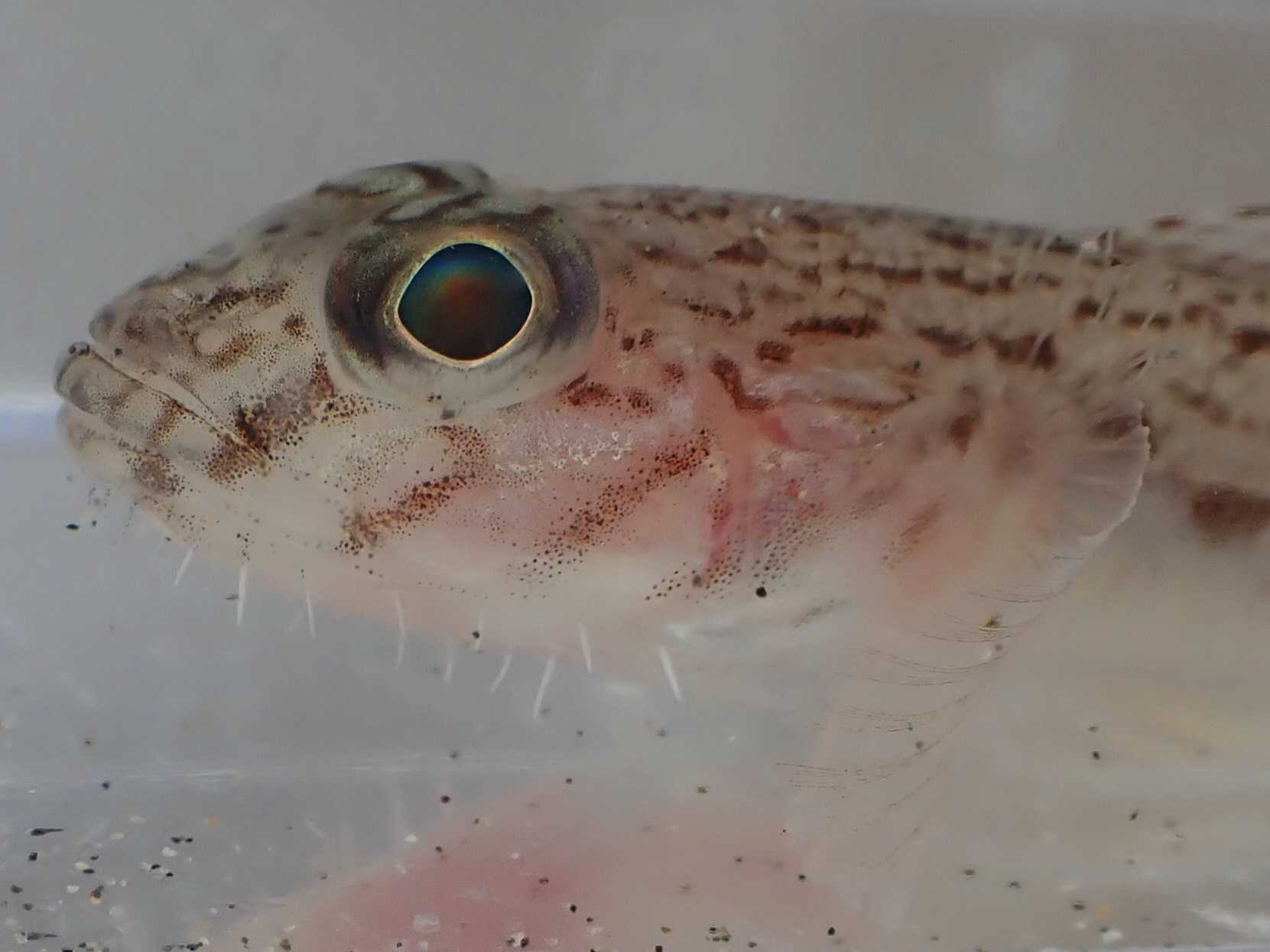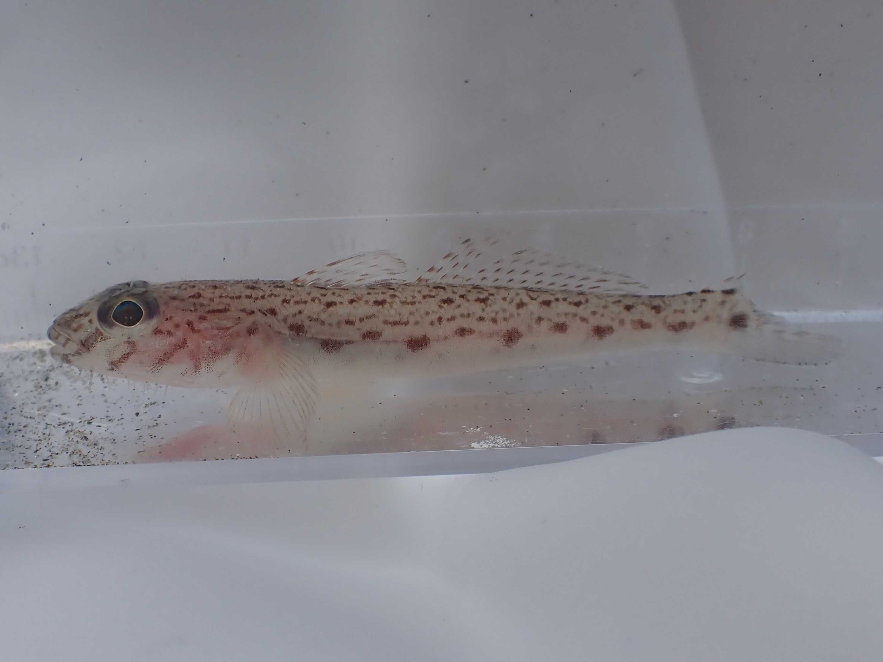 下げ潮でできた砂地の水溜まりに取り残されていた。こういう場所にいるハゼにしてはでかいな?と思ったらヒレがところどころ欠損していたのであまり元気な個体ではなかったようだ。特徴であるおヒゲを観察。
