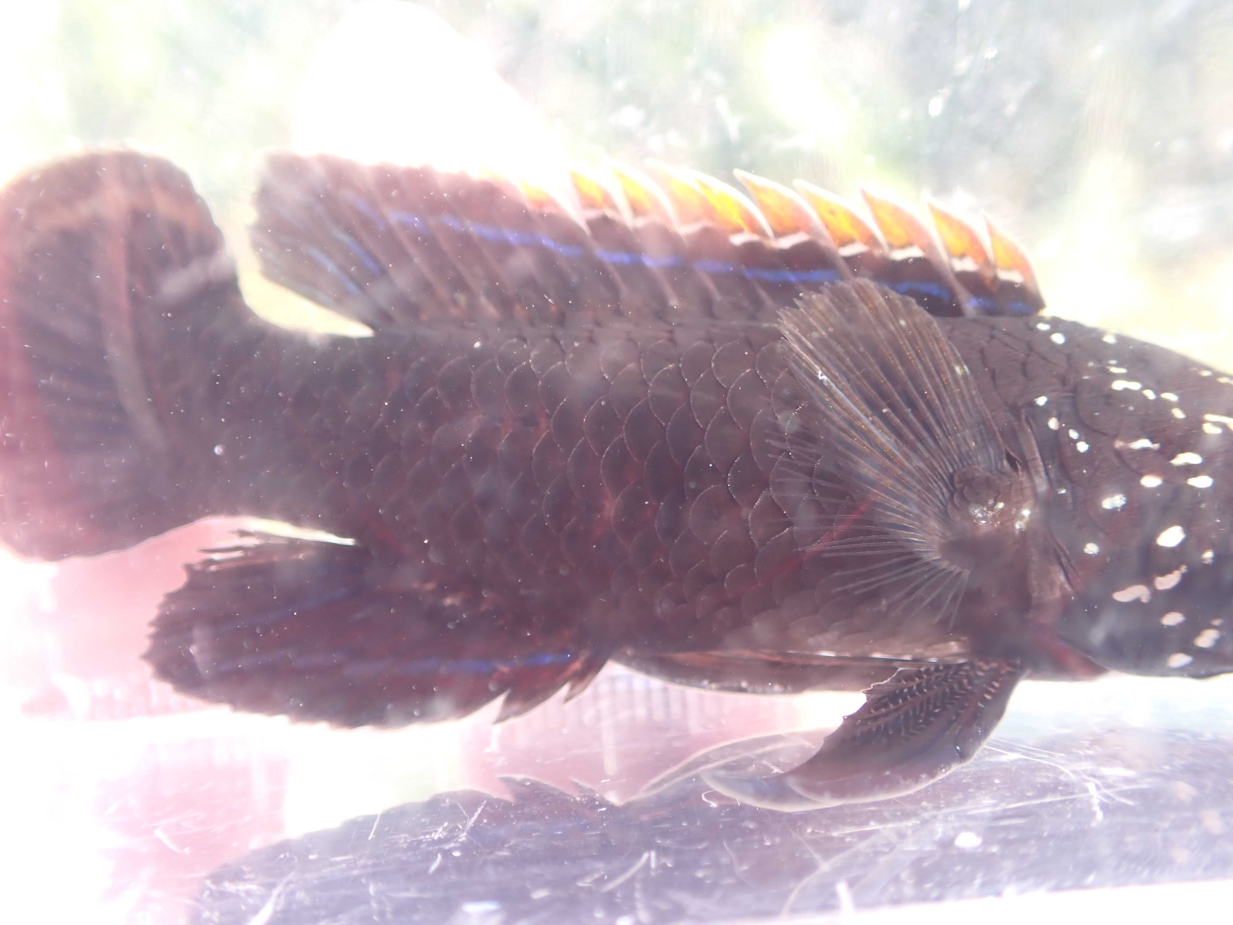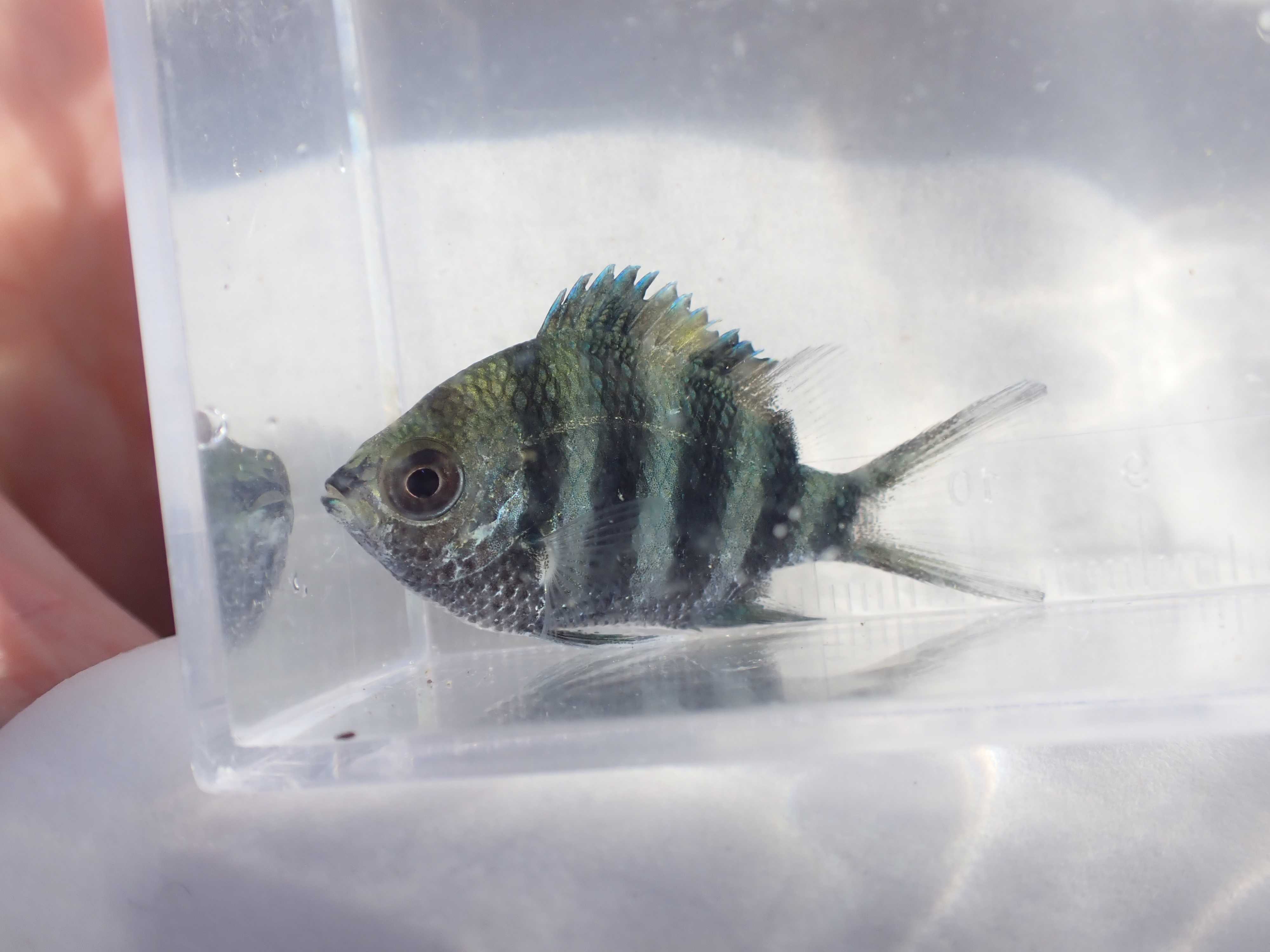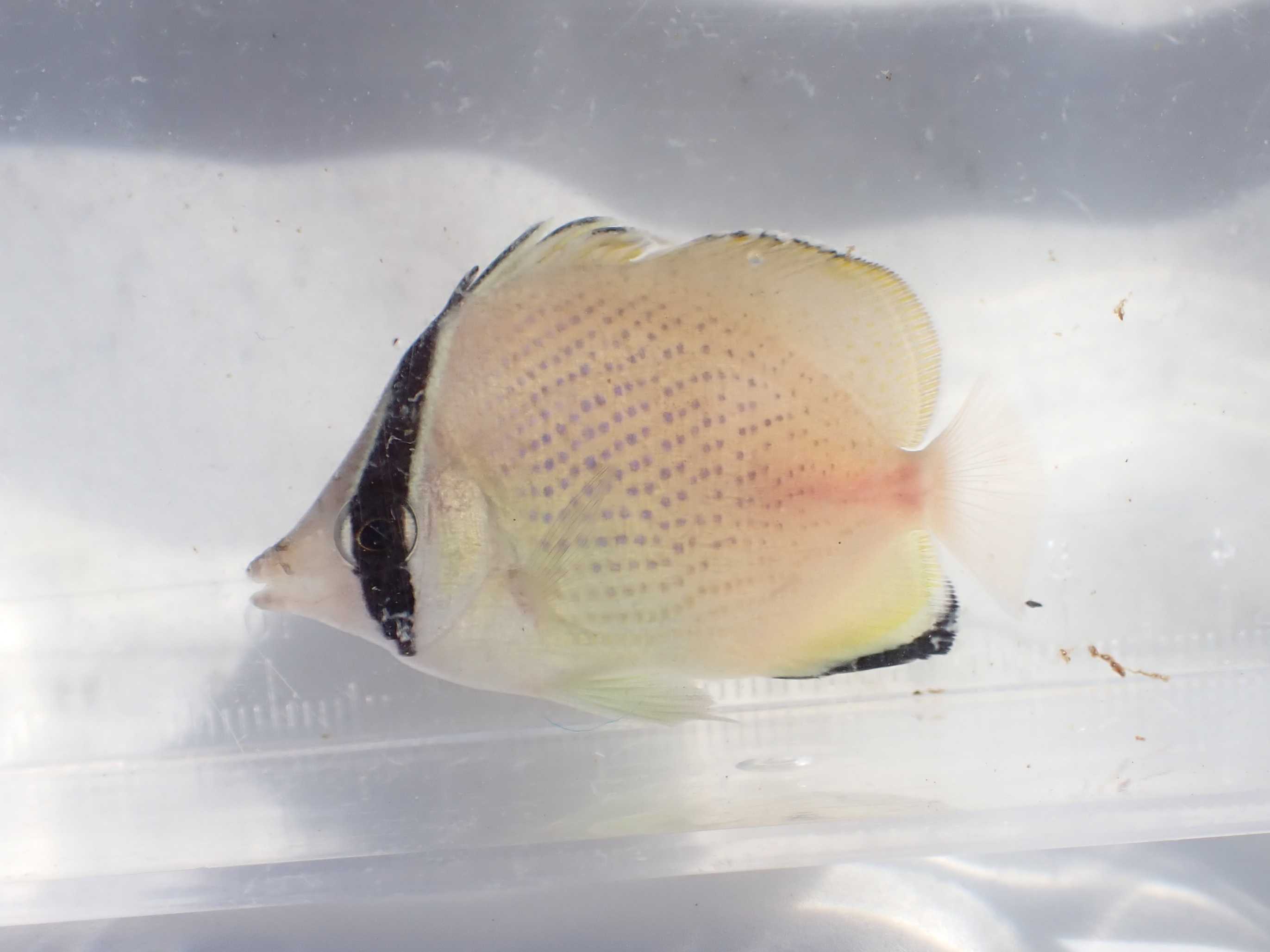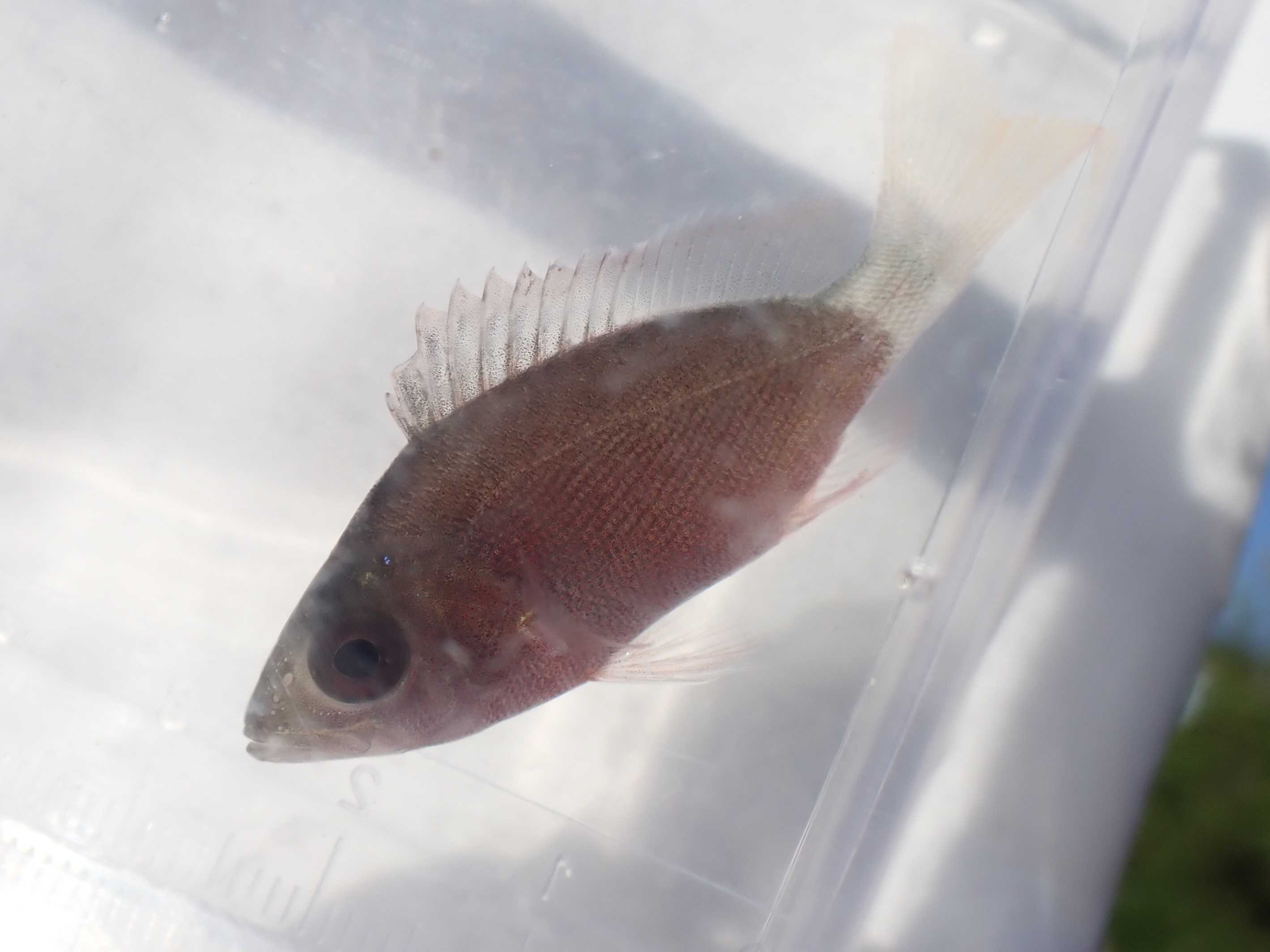 そこまで苦戦することなくゲット。背鰭の真ん中あたりにケガの名残があった。パステル調の色合いが綺麗。だからこそ臀鰭の黒い縁取りが鮮明に映えるのだ。