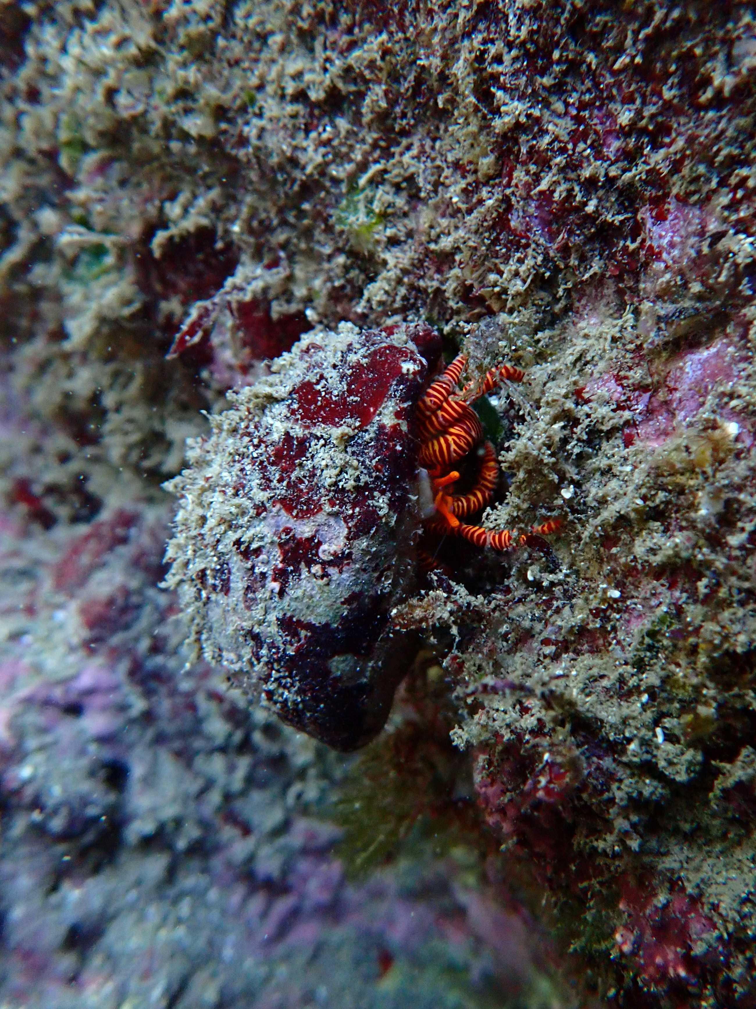 赤色繋がりでまた見つけたベニワモンヤドカリ。以前は嫌われて写真が撮れなかったけど、今回は水中で慎重に、綺麗な写真が撮れた!いつ見てもサイケデリック。そういえば海外にこういう柄のヨウジウオがいたような…メニイリングドパイプフィッシュだっけ、そっくりだけどなんか共通点があるのかな?