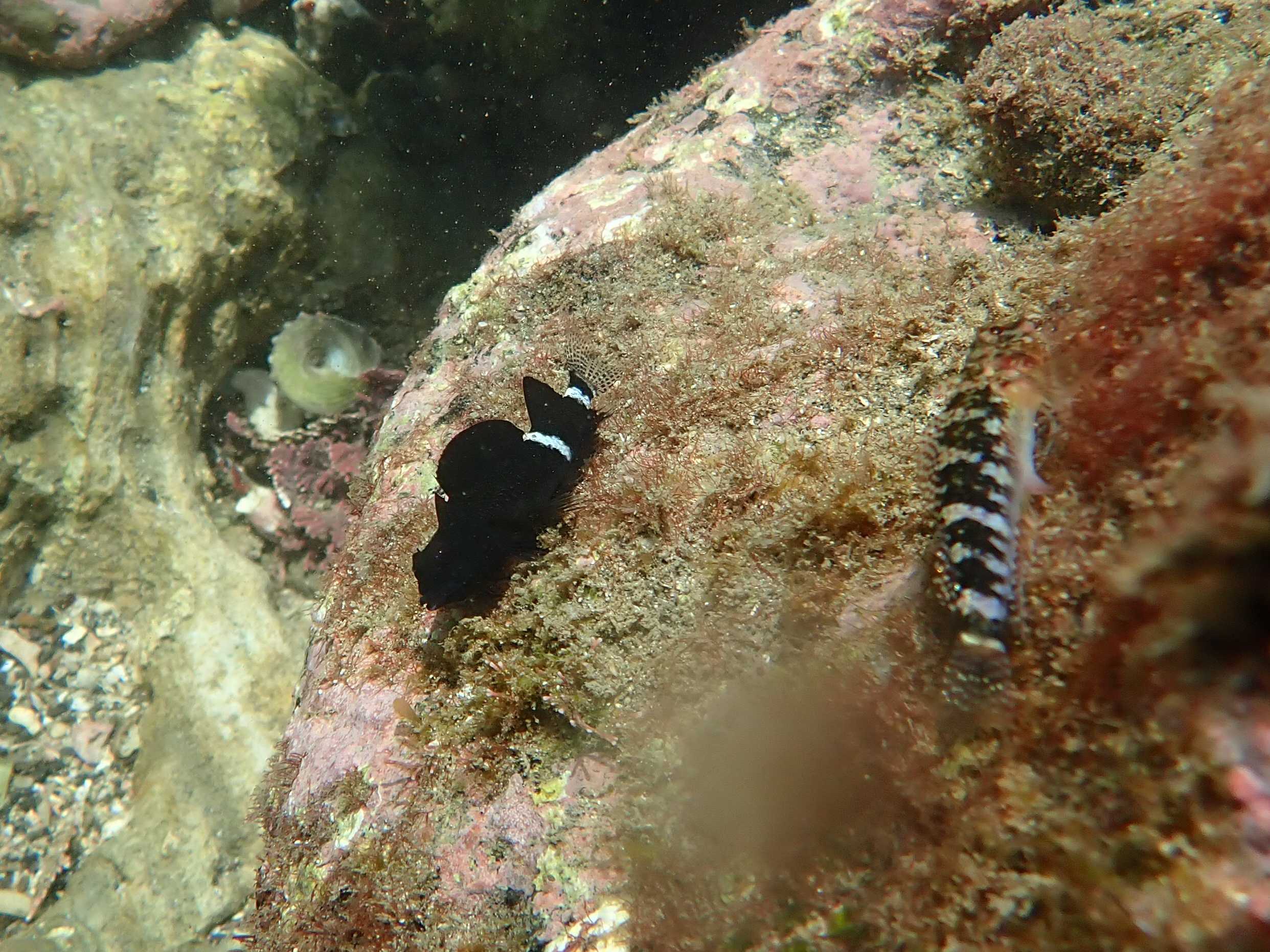 前回岩についた手を攻撃されたヘビギンポ。やはり繁殖期真っ盛りで白黒コントラストの美しい♂と♀のペアが至るところで見られた。