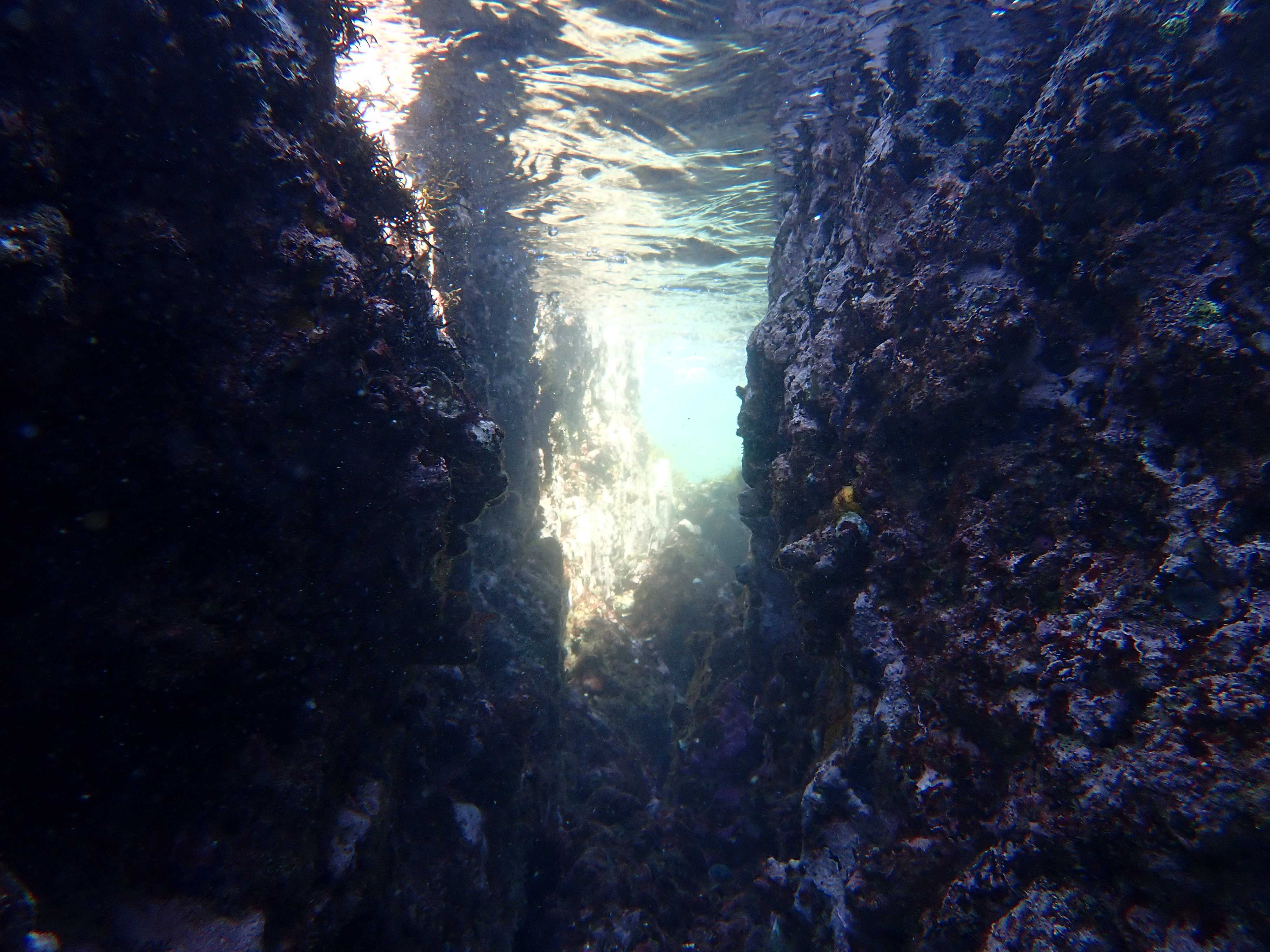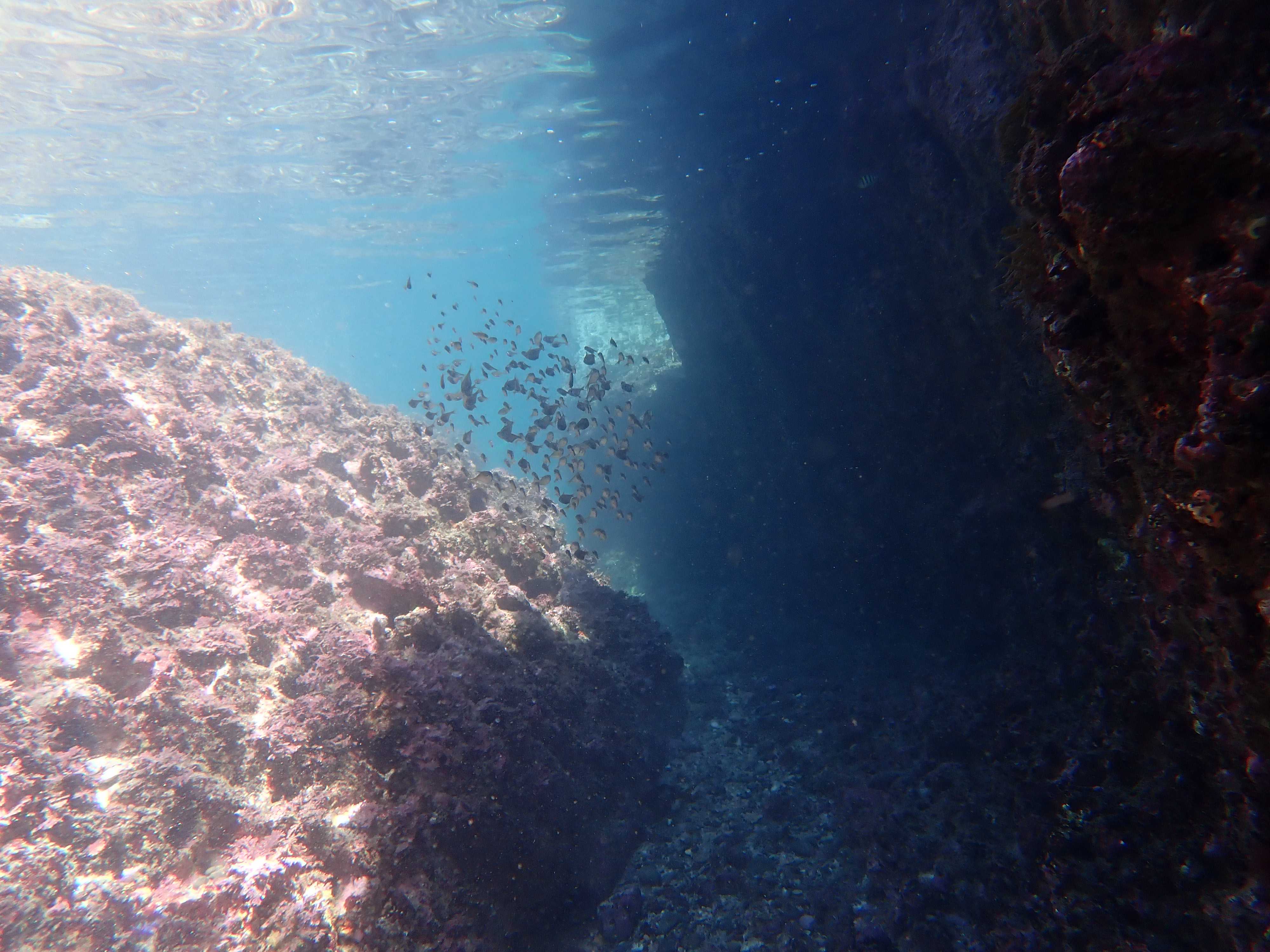 浅瀬の回廊。こういう壁際や通路にはミナミハタンポがのんびり群れていて、日差しを受けてキラキラしている。