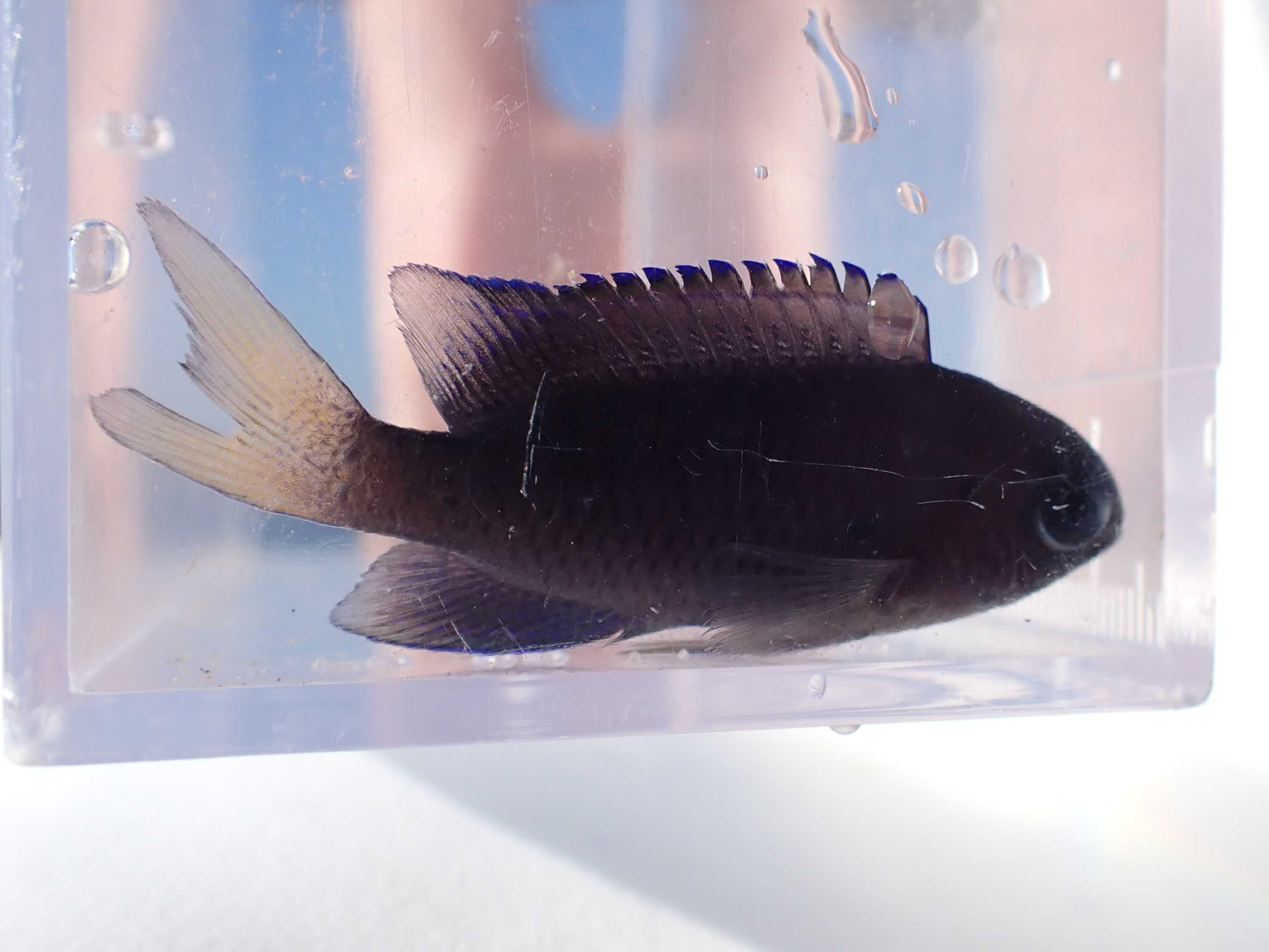 ソラスズメダイ。何の魚か忘れちゃったけど一緒に網に入ってきたのでたまにはキープしてみた。案の定真っ黒。