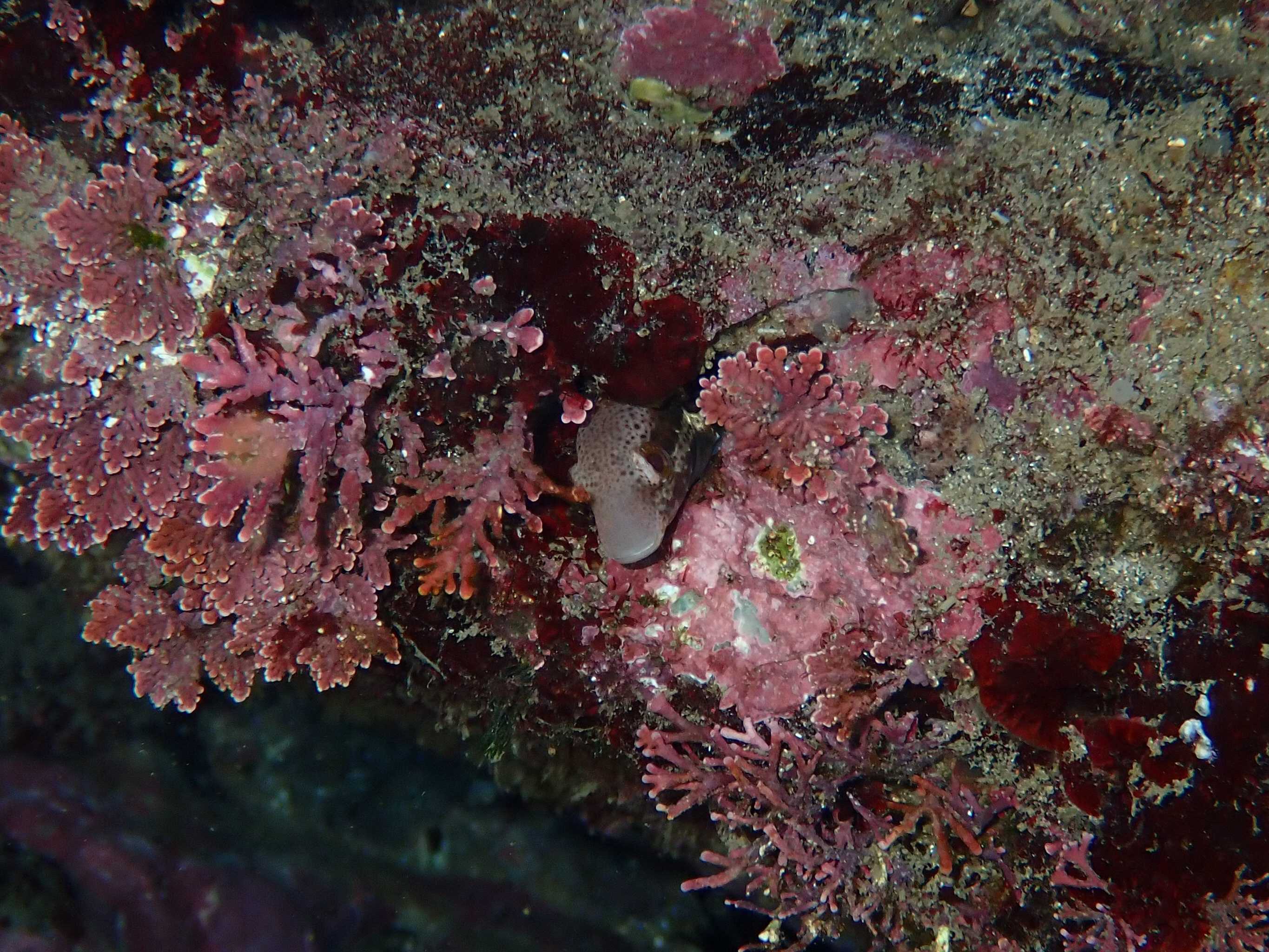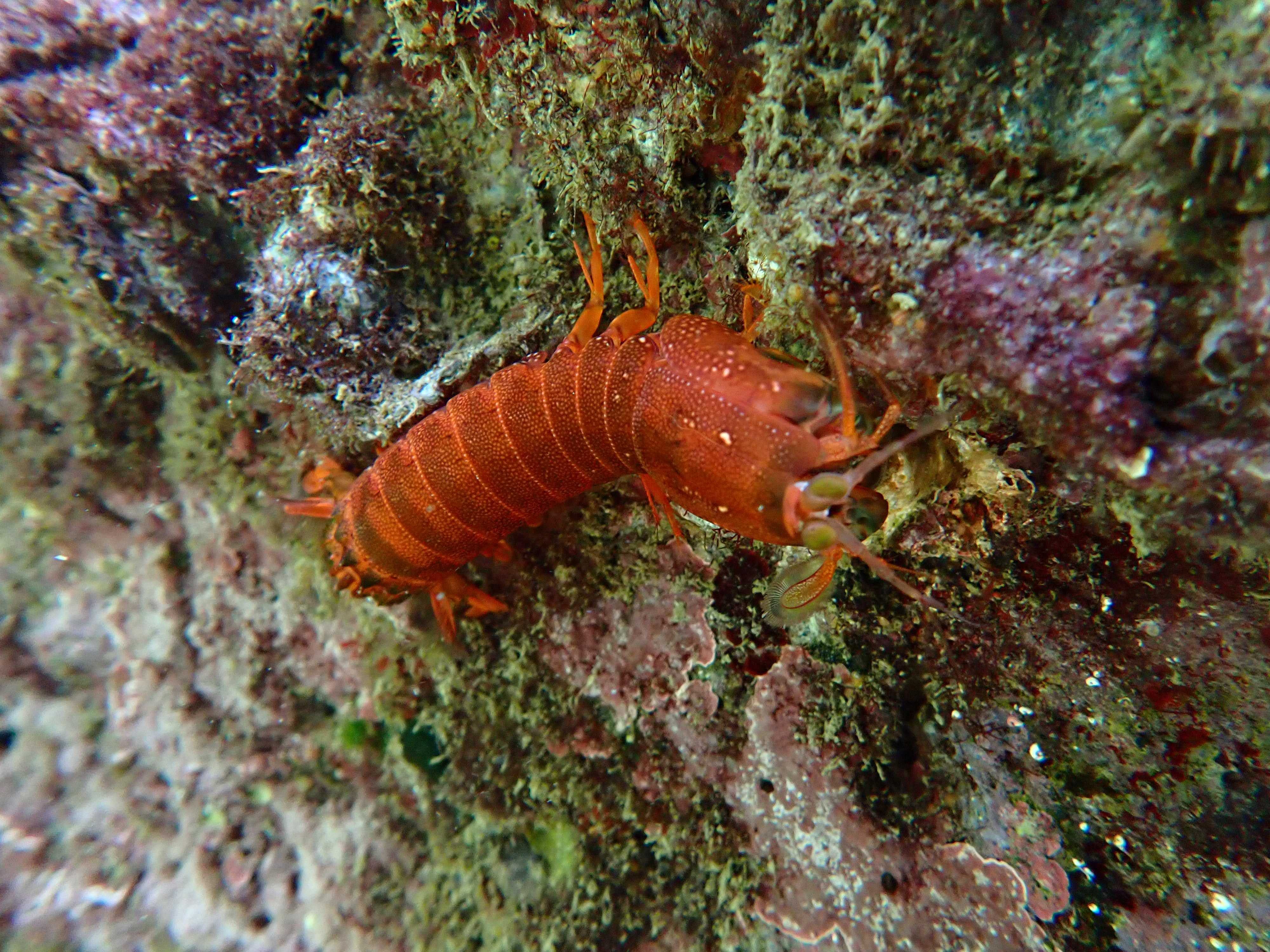 壁の水面近くを見ていたら、ものすごい色で主張するシャコがいた。たまに見るけど、なんていう種類なんだろう?尾節?だかを見なきゃいけないらしく、写真からの種同定は難しいと海洋大生に聞いたことがある。