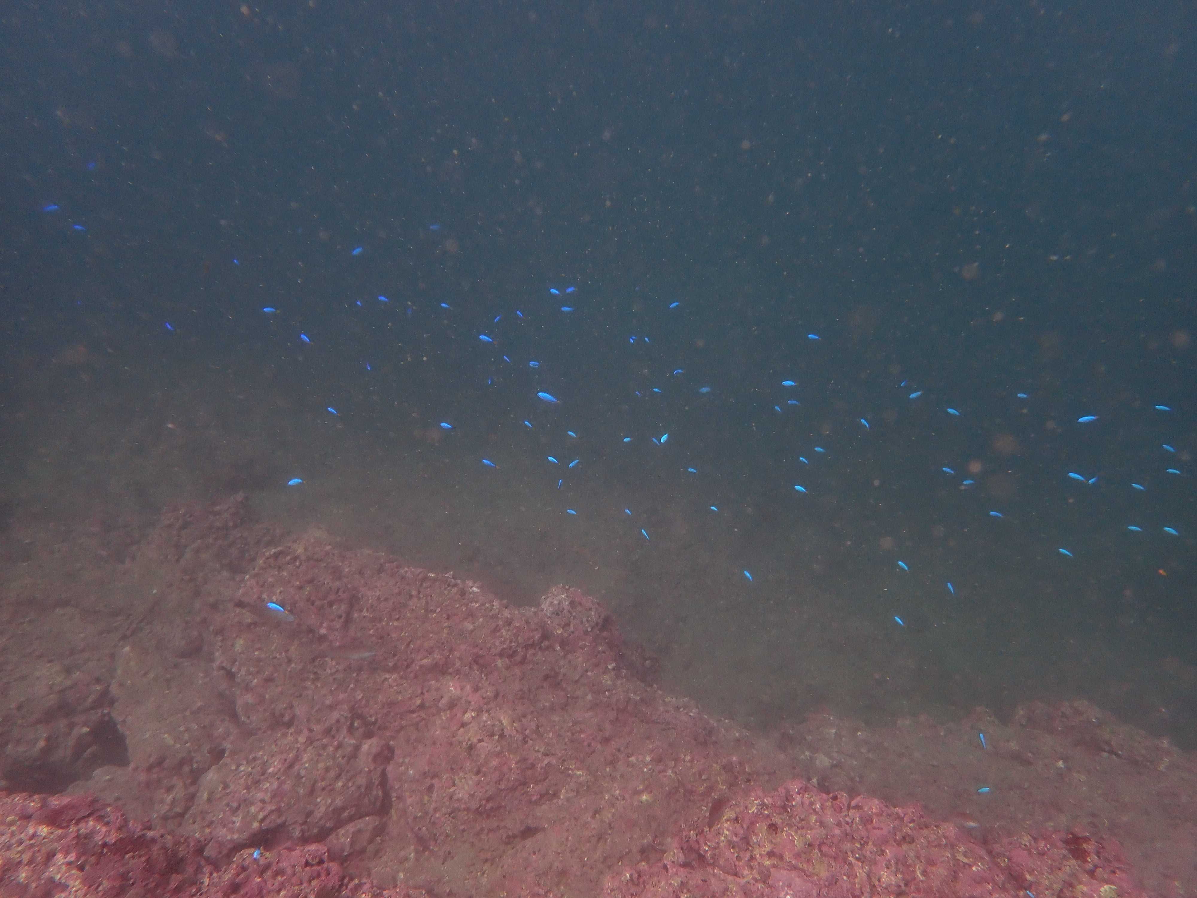 深く潜っていくと、ソラスズメダイが乱舞していた(この日はどこもかしこも結構な大群がいた)。