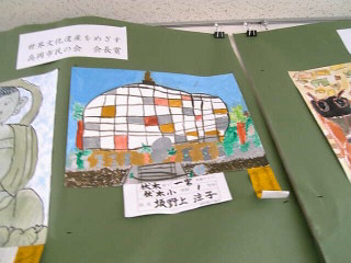 先月の暑い中、自宅の裏山で描いてきた娘の絵が今度小学1年生の絵として「世界文化遺産登録をめざす高岡市民の会会長賞」なるものを頂くことになり今日見に行ってきました。とはいえ、描いたときにその絵を見ているのでどんなものかは分かっていたつもりですが、やはり賞の名前が記されたリボンが付くと一目置いてしまいます。写真の通り、モスクのようなものが描かれていますが、これは仏舎利塔といい、お釈迦様のお骨の一部が埋葬されていると伝えられている半球状の塔で高さは20メートルくらいあるでしょうか。私も小学校2年のときにこの同じ仏舎利塔を描いて写生大会の金賞を頂いたことがありました。娘も同じものを描いて市の写生大会の特賞をもらおうとは・・・。運命のつながりというものを感じさせる出来事でした。人気ブログランキングへ