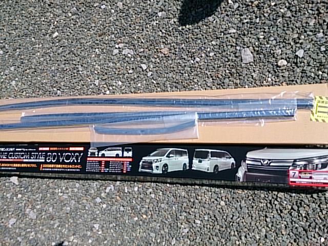 なんかサイドラインが気になりこんなの付けてみました。そうです。あれです。シルクブレイズサイドウィンドウクロームモールです。ウインド下のゴム部分を覆う様に張り付けるだけで何か高級車になった様な感じになります。ノア80系には、純正のオプションで出ていますが高価なためこちらの商品にしました。これ思っていた以上に出来が良いです。素材はABSにメッキなので軽い為取り付けもかなり楽だし付けそこなってもステンレスの様にひずみが出たりボディーを傷つけることが無いです。仕上がりは、まさに純正品と同等です。でも自己満足の世界かな ↓箱から出した運転席側の4点です。左右1セットで16,800円↓袋から出しにくいので袋を切って取りだします。(接合面にそって簡単に手で切れます) ↓取り付け前です。白には黒が合いますが‥ ↓取り付け後です。どうですか?引き締まったでしょう ↓取り付け後のアップ画像です。 ↓取り付け後の仕上げは、そうです。これこれメッキングでコーティングして完了80系ノア/ヴォクシー(全グレード/煌含む)シルクブレイズ サイドウィンドウクロームモール 80系ノア/ヴォクシー(全グレード/煌含む)