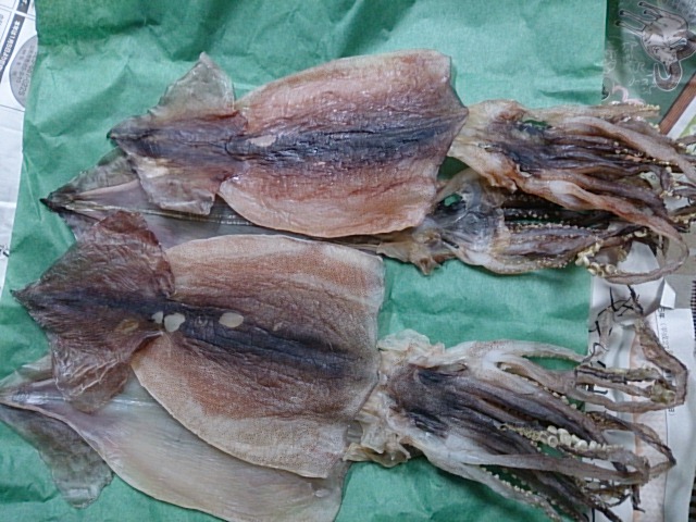 せっかく山形まで釣りに行き手ぶらで帰って来るにはもったいないのでおいらは、ときどき干物を買ってきます。たまたまイカが食べたくなったので鼠ヶ関へここは、イカの干物が有名で6軒くらい店が連なってあります。当然イカ以外も有りますよ購入したのは、一夜干しとスルメの中間のイカ4枚1,200円と醤油干しのホッケ小2枚600円也↓イカの干物 ↓ホッケの干物