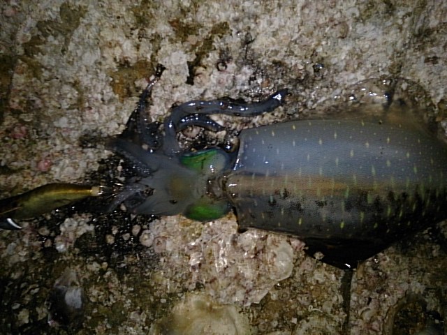 11月21日~23日の朝まで西伊豆でエギングしてきました。初日の夜7時頃2杯立て続けに取れただけですが初めての地で取れたことに満足です~↓3号のエギで最初にかかった1杯目です。胴寸22cmくらいです。締め損じて胴半殺し ↓2杯目で胴寸約20cmです。 ↓600mlのペットボトルと並べてみました。まずまずのサイズでしょ?