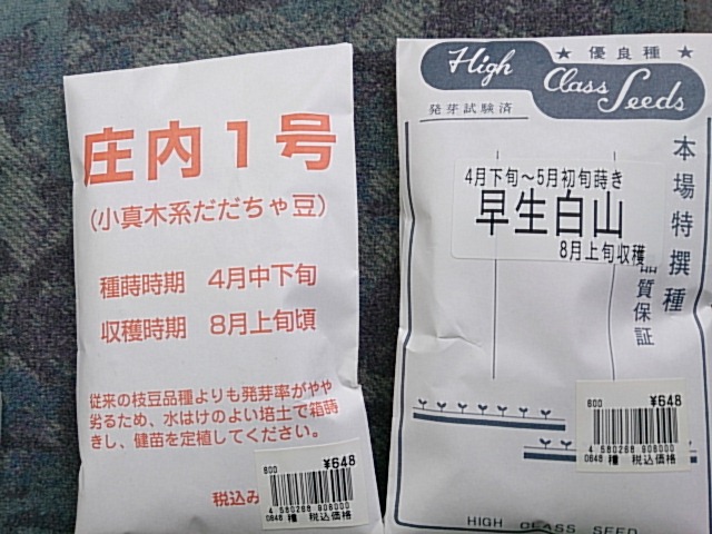 山形へサクラマスを釣りに行く初日には、必ずだだちゃ豆の種を買ってきます。もう10年くらい買って来てるだろうか?知人にもお土産代りにあげたりしてます。ゴールデンウイーク前後に種をまき7月の末ごろから収穫が出来るようにします。このころに収穫できるようにしないと虫の攻撃にあい壊滅状態になるから早生品種しかおらが町群馬県某所では栽培できまへん本当は、晩生種を作りたいけどね〰今日は、天気も良いし家庭菜園日和なので種でも蒔こうかな ↓毎年定番の庄内1号と今回初めて購入した早生白山です。白山と言えばだだちゃ豆の王道