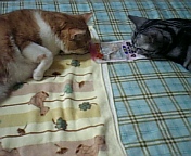 今日はプーと大吉の微妙な関係です。基本、2匹は余り仲が良くありませんプーは11歳のお爺ちゃん猫なのでゆっくりしたいのに、大吉はまだまだヤンチャ盛り♪遊びたくてしかたが無いみたいでZZzz…(。-ω-)。。o寝ているプーにチョッカイを出したりしています。そんな2匹の間にある微妙な距離が実に面白かったりします。どちらも甘えたです取られたょ~~という表情が笑えました((´∀`*))ヶラヶラ わぁ~ぃ♪おやつだぁ~♪ 兄ちゃんがよそ見してる間に食べちゃうぞ~♪ 大吉に全部取られた・・・俺のおやつ・・・ ☆:;;::;;:*:;;:;:*☆;::;;:*:;;:☆;:*:;;::;;:☆:;;::;;:*:;;☆:;;::;;:*:;;::;;:*☆:;;:::*:;;::;;:*:;;☆ 僕の大好きな紙くずがすぐそこにあるんだけどなぁ~ 兄ちゃんも狙ってるっぽいし・・怒ったら兄ちゃんこわいしなぁ~ (-_★)キラーン!!サッサッサ!!スゥーーーっとプーの手が伸びて お母さ~~~ん兄ちゃんに取られたょ~(*´;ェ;`*) それじゃ~またd(-ω・。)ネッ☆。βyё βyёにゃ~☆彡