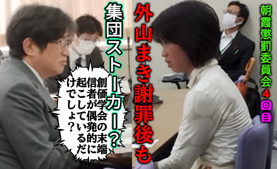 埼玉県朝霞市の外山まき市議(53)に対する懲罰委員会は、2025年4月8日で4回目となり、年をまたいで続いている。委員会のメンバーも、副委員長だった小池たかのり市議(54)が同年2月に急逝した関係で代わりに、ごん純一市議(42)が副委員長を務めた。 そして、新たに渡部竜二市議(45)が委員会に加わっている。〈つばさの党唯一現職議員外山まき氏が、過去に行った朝霞市議会の謝罪、その発言自体を撤回せよと議会から言われたのが昨年2024年6月のことであった〉2024年6月14日「外山麻貴議員に対する懲罰動議」が発議され、懲罰委員会での審査が開始された。埼玉県児童虐待禁止条例を撤廃する活動をしていた際にたはら亮市議(49)に遮られ、つばさの党黒川あつひこ代表(46)らがたはら氏の自宅にて抗議をしようと出向いたことに対する内容や、『つばさの党』の党員杉田勇人氏(40)を紹介するにあたり、杉田氏がある特定の宗教団体〈創価学会〉から意図的に嫌がらせを受け、猫の生首や胴体を自宅玄関に置かれたなどと発言した内容9点の指摘事項等に対して外山市議は、指摘された点の発言を取り消し謝罪した。しかし、直後の支持者向けに勉強会をしたものの、その内容が支持者によって動画公開され、そこではお詫びの内容とは真逆の発言をしたことが複数の議員を怒らせた。「外山市議は全く反省をしていない」但し本来懲罰委員会は、あくまでも議会の上の発言について懲罰を問うものである。が、外山市議が個人の勉強会の動画内の発言内容が不適切だとして、本当に反省しているかの真実を問いただすことが、謝罪の誠意を確認するためだとして、懲罰審査が延々と長期化している。利根川仁志市議(65)は「議会の発言が真実で、議会外での発言は真実でないとすれば」とした上で更に「伝聞による不確かな情報、事実誤認、名誉毀損だとかと言うことは『個人』として、あるいは『つばさの党として』同じ考えで宜しいのか」との問いに、外山市議は「支持者と話す時は私達側の真実と支持者側の真実があるが」とした上で「朝霞市議の場合、主観的な真実よりも公共の福祉等があるのでわきまえて話したい」と改めて反省の意を表した。〈黒川滋市議「宗教団体の集団ストーカー行為の認識について」また何故か黒川あつひこ氏の朝霞市長選挙についても言及〉黒川滋市議(54)は旗手し自ら発言の機会を得、「この発言は撤回されているけれども」と前置きし、宗教団体のストーカー行為について述べた。「特定の宗教団体の司令を受けて末端会員が集団ストーカー行為をしているというと意味が違ってくる。一会員がたまたま勝手にやったことであって、宗教団体が知り得てやったこととは思えない。」と持論を展開し「宗教団体としてストーカー行為をやれと言っているわけではないのではないか。」と問いただした。その答えは外山市議が知り得る範疇ではなく、「東京15区補選の公職選挙法違反の疑いで公判中の杉田とは接見禁止命令が出ているので話し合いもできない」と述べるに留まった。また、黒川氏はつばさの党黒川あつひこ氏の朝霞市長選挙の際の態度にも触れることとなったが、懲罰委員会の言及する範囲に及んでいない。「朝霞市長選挙に於いてはわたしは全くの裏方に徹していた」と黒川あつひこ氏とは動向が違う事を強調した。自身が公明党である立場から、利根川市議は、発言は取り消しになっていることを踏まえながら、特定の宗教団体であったり政治団体の名誉を傷つけていると苦言を呈した。〈一部の宗教団体『創価学会』による集団ストーカー行為〉外山市議の発言には、つばさの党の組織運動本部長である杉田勇人氏(40)がなぜ政治活動に加わったのかという経緯が述べられていた。〈外山市議の過去の消された発言によると〉「つばさの党杉田は過去に仕事で創価学会の不正を暴いたところ、創価学会信者による嫌がらせを受けるようになり、そこから運動しているんであって、そんな杉田の発言を抑えようと思ったら、政治家の政治倫理条例、朝霞市の政治家の政治倫理条例を作っても、杉田は政治家でも候補者でもないし、朝霞市民でもないので意味ないんじゃないですか?と言ったんです。」略 などの内容があった。こうした発言は全て議会から取り除かれ、外山市議は「事実誤認」として撤回し謝罪をしている。 しかし外山市議はまた再び、謝罪を要求されることとなった。〈外山市議の懲罰について〉懲罰動議は4段階罰。1段階目は勧告で議長が注意をする。2段階目が陳謝で、私が議会の決めた謝罪文を読む。3段階目が一定期間の議会出席停止。4段階目が除名で、議員たちが結託したら議員失職することまでできる。委員長である遠藤光博市議(60)は、今回の件で3・4段階目の処分は全国的にもこの事案では重すぎるとの見解を示し、1〜2段階の処分が妥当との認識を示した。ちなみに懲罰委員会の市議は11名。たはら亮ごん純一利根川仁志遠藤光博石川啓子(62)黒川滋野本一幸(