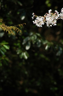 今日の桜は疲れました^^;やっと写真の確認完了では昨日の桜につづいて本日もつるぎ町(旧穴吹町内田)から天神桜のまだまだ山奥清流穴吹川から支流に入った場所。道中ヤマザクラの間をすり抜けてまっすぐに伸びる杉発見車を止めて山道を直線で600m。体感は1km以上^^:しかもこんな警告つきコレハカナリコワイ前はこんなのなかったぞ!っていうことは最近出たのか!?ビビッて腰が引けた状態で登山。半分以上歩いたところで「ガサッ!」ん?ガサガサガサッ!ひぃ~!イノシシ? クマ?ドサッ!なんだ・・・。落石か・・・。落石!!!!危ないよ!しかも50cmはあるぞ しかも目の前に落ちるなんて。当たってたらお陀仏でしたそんなこんなで辿り着きました「世の中桜」デカイ花は咲いてるけど周りの杉より頭ひとつ抜けてて逆光で見えない。桜より上へ登ることにする。近づくとかなり威圧感がある。周りの杉と比べるとその大きさがわかる。カメラの三脚を杖代わりにして桜を見下ろせる場所へ45度~50度位の急斜面に立つ桜の上へ登るのはかなりきつかった^^;途中で1枚そんでやっと全体を・・・といっても入りきってませんが。この内田のエドヒガン桜は県の天然記念物で500~600歳。枝も旺盛で杖一つつくことなく元気な体。見事な巨木のわりには花は小粒で3~4mm程度苔むした枝からはまた違う若木が育っていました。この桜、滅多に花が満開しないことから、満開の年は景気が良くなると云われ、「世の中桜」と呼ばれるようになりました。今年は満開^^どんな景気になるんでしょう?余談道中で見つけたのはどう見ても危険な光景とどう見ても不自然なものでした^^