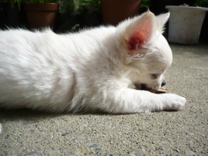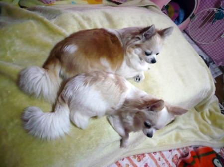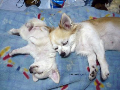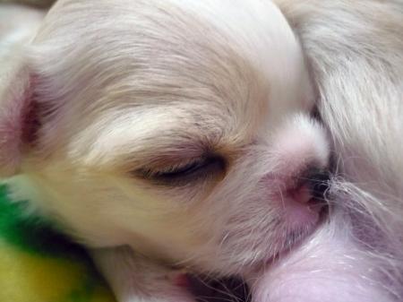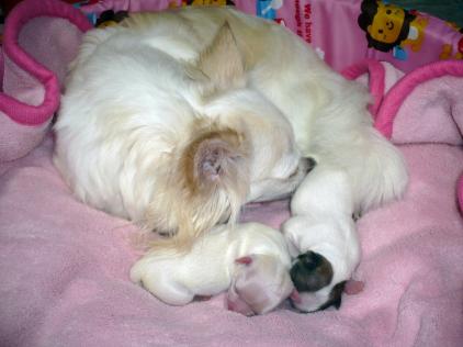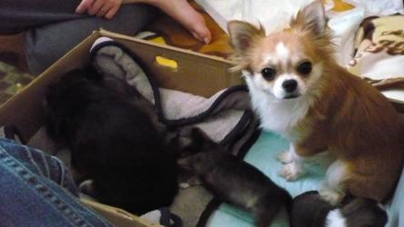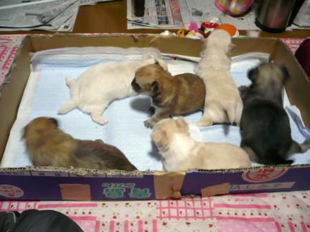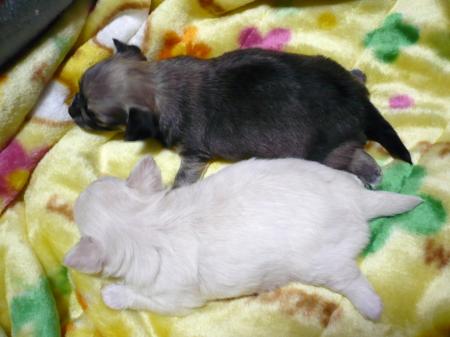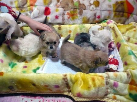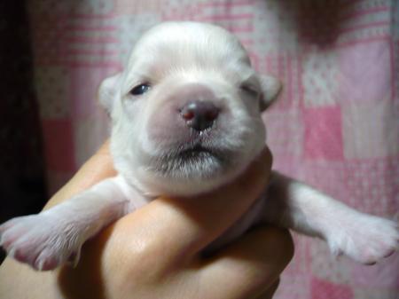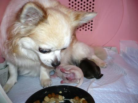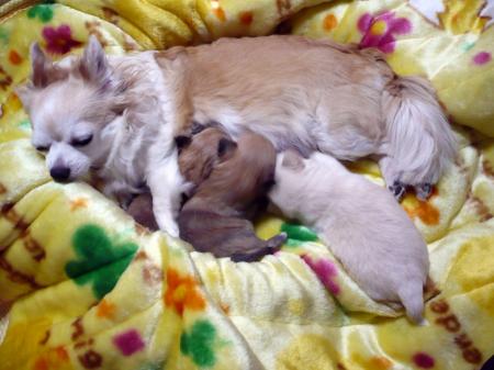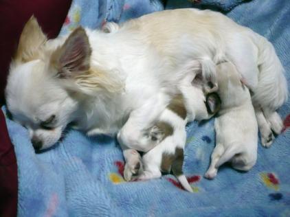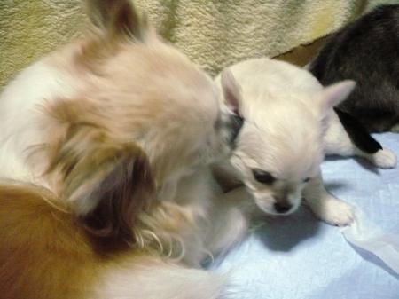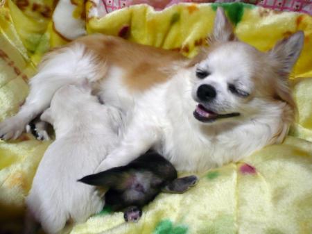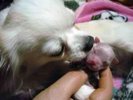 朝3時20分に、白い女の子が生まれてつぎの子が、なかなか出てこなくって今日は、獣医さんもお休みお腹を、さすって やっとのことで、10時20分に男の子無事に生まれて良かった予定よりも、少し早く生まれて白い所に、茶色の男の子 120g白い女の子 125g嬉しそうに、赤ちゃんを舐めています赤ちゃん欲しそうワンコ達と一緒に、頂きました 赤ちゃんの成長が、楽しみです