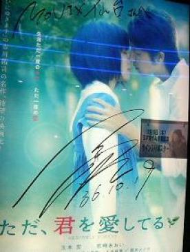 今日は、玉木君が仙台に映画の宣伝&舞台挨拶に来てくれました。ラジオにテレビに雑誌取材に忙しかったようです。友人は5時前に行ってチケット交換に並んでくれたんだろうけれど、大体100番目くらいだったそう。舞台挨拶のときに司会者から「一番目に並んだ人は何時からですか?」と質問されてましたが、その人はなんと2時からだそう・・・すごいですねぇ~私など、6時40分に集合に間に合うように行くのがやっとだったんだけど。でも友人のおかげで、4列目に座れました玉木君は、いまのドラマに合わせた髪形のよう。黒い服で、シックでした。写真はもちろん撮れませんでしたが、映画館のポスターにサインを書いていってくれたようなので、みんなでパチリ。よけいな青い線が入ってしまいましたが、お許しを♪