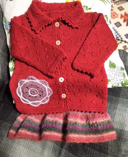 編んでる途中にピカッと閃いて、ベストはやめて赤ちゃんのスカートに変えました。