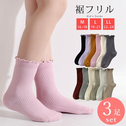 靴下 キッズ ソックス 3足 セット 子供 リブ フリル 表糸綿100% コットン 女の子 16cm〜21cm アソートセット 16 17 18 19 20 21 オフホワイト ライトピンク パープル マスタード グレー インク ブラック 可愛い 通年 送料無料
