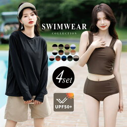 タンキニ 水着 レディース 体型カバー 長袖シャツ ラッシュガード ハーフパンツ 4点セット ビキニ セパレート オーバーサイズ UPF50+ 無地 ビスチェ風 黒 20代 30代 40代 ママ水着 二の腕 ウエスト お尻 太もも カバーアップ 露出控えめ 大きいサイズ