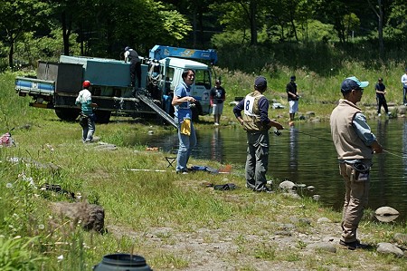 ☆第22回SECフィッシング大会 白河フォレストスプリングス ☆6月6日午前10時50分、川側下流に移動して第5回戦です。20分ほどすると上流で放流が始まりました。Kumaさんは、チャンスとばかり一気に4匹釣ったのです。大物が入っていなければ良いのですが…Hideさんは、Kumaさんの魚の計測で忙しかったようです。しかし、ようやくボウズ脱出の貴重な1匹を釣ったのでした。3大会連続ボウズがかかっていたHoriさんにヒットです。参加者全員ボウズ脱出の奇跡が起こった瞬間なのです。この場所でKonさんは1匹釣り、合計9匹と数を伸ばしました。私に放流の恩恵はなく、Tomのバッレトで1匹釣って合計3匹。これでも、やっとKonさんの釣り数の3分の1です。残りの競技時間は45分。さすがに、もうだめです。自分の技術の拙さを、今更ながら実感するばかりでした。 釣果当てクイズの正解者は1人も出ないかもしれませんね。(続く) ⇔投票して頂けると嬉しいです⇔■第42回オーパー!ルアーコンテスト ⇒ 6月20(日)9:00~