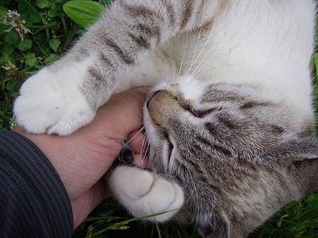 ☆白河フォレストスプリングス ☆6月13日確か、猫がなでられると喜ぶツボは喉だったはず?30年以上前に野良猫を拾って飼っていました。その当時のことを思い出してくすぐちゃいました!「うれしいニャン」と猫ちゃんが言ったような気がしました。動画前足を上げたまま寝てしまいそうな猫ちゃんの様子です。年をとっていますが、毛並みは美しく、あまり汚れていませんでした。喉をなでても、頭をさすっても、けっして私に爪を立てません。この猫ちゃん、野良猫ではなくて、この近くの飼い猫かもしれません。釣り場の裏山を越えて、魚を食べに来ていたのかな? (続く) ⇔投票して頂けると嬉しいです⇔■第42回オーパー!ルアーコンテスト ⇒ 6月20(日)9:00~