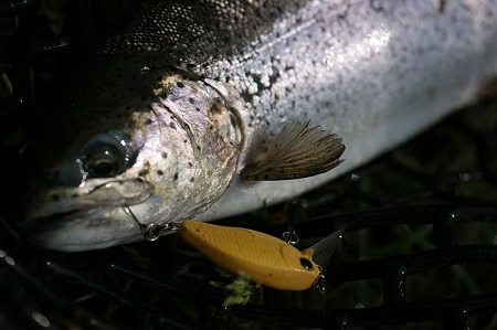 ☆第42回オーパー!ルアーコンテスト ☆6月20日撮影:O名人 3回戦後半、表層でトリックトラウトを引いて魚を掛けました。対岸からO名人が写真を撮ってくれていました。今度は、ばらすわけには行きません。ようやく1匹を釣りました。ボウズ脱出!サイズは44センチです。ここでちょうど前半戦が終了しました。あの魚、SECフィッシング大会なら優勝サイズですが、オーパーではどうかな?このイチゴほどは、甘くは無いはず・・・ (続く)サッカー日本代表の勝利、嬉しいな! 今日は日本中で、何か良いことが起こるような予感がします。◇第43回オーパー!ルアーコンテスト 8月1(日)9:00開始 魚系以外のプラグでの数釣り競技・・・