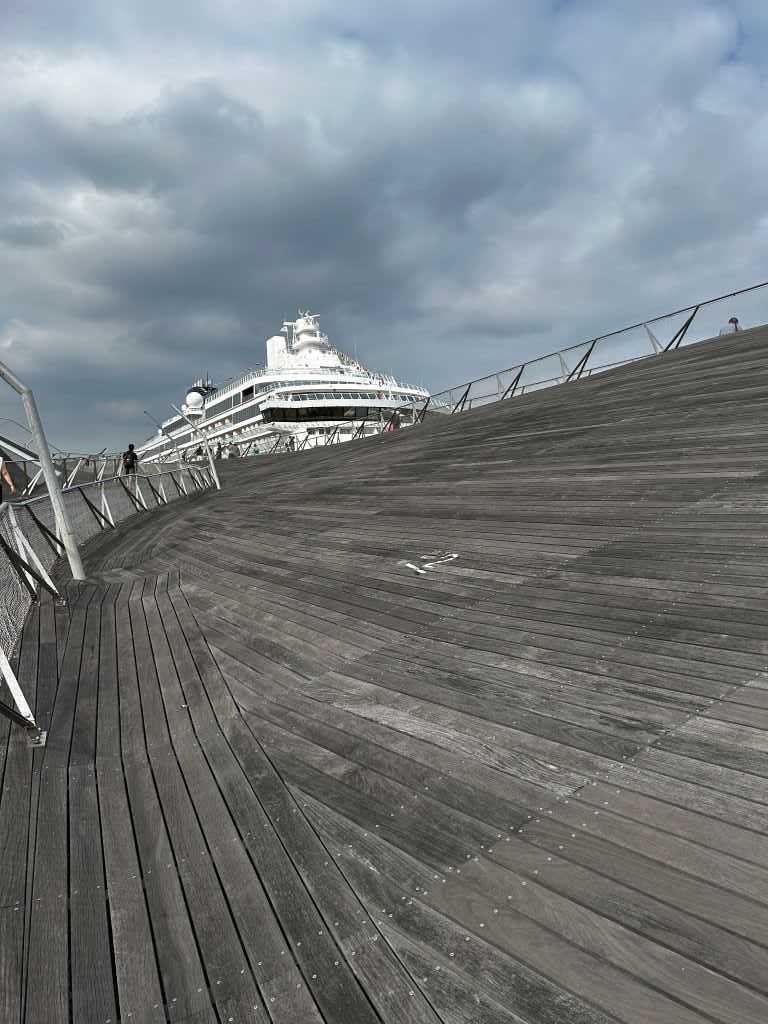 ◇2025年7月12日◇横浜◇横浜大さん橋へ向かいました。風は涼しくても日差しが強くて暑い・・・旅客船が目に入りました。飛鳥Ⅲというクルーズ船でした。前日まで飛鳥Ⅱも停泊していたとか。こんな巨大な旅客船を見ることができて幸運でした。飛鳥Ⅲのすぐそばを赤いバスが通っている!旅客船とバスの大きさを比べると、いかに飛鳥Ⅲが大きいのかよく分かります。水陸両用バス、スカイダックでした。陸を走るバスが水上を走る、面白い光景です。遅い・・・ですが。大さん橋の端まで行って景色を眺めました。学会場となっているパシフィコ横浜が見える。(続く)クリックしていただけますと嬉しいです!