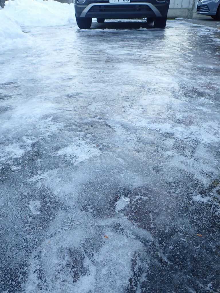 外からカンカン、カンカンと音が聞えました。家内と蛙太郎が路面の氷割り、氷剥がしをしている・・・音を聞いたからには参加しないわけにはいきません。
