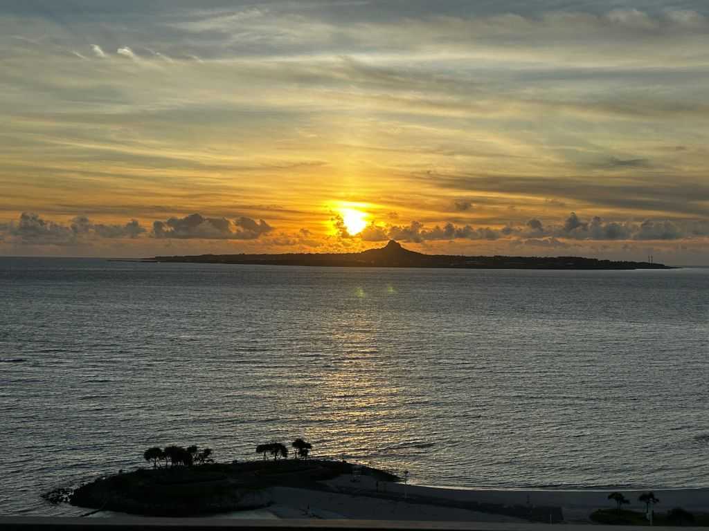 夕食後、ホテルから伊江島方面に沈む夕陽を眺め・・・