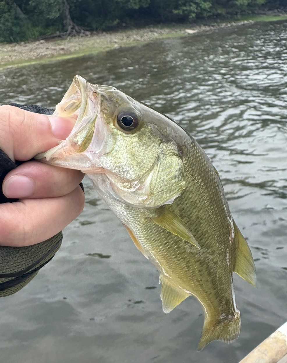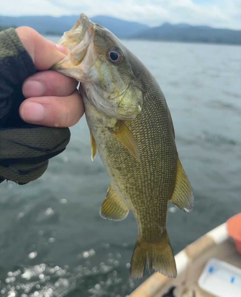 12時、スピナーベイトで1匹目、スモールマウスバスを釣りました。