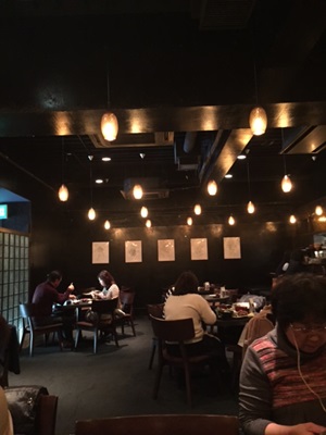 ここは山芋料理のお店暗いんです全体が黒を基調にした造り履物を脱いであがります お昼の定食¥1380なりサラダ、麦とろ、つくね、味噌汁、デザートごはんとみそ汁はおかわり自由ここの味噌汁はおいしいよ大根をおろし金でおろして入れてるのよ普通のおろし金じゃなくて目の粗いおろし金これは試す価値ありよ
