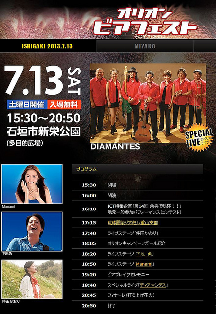 13日(土)に予定していたオリオンビール祭りも、大型台風のため15日(月)に延期になりました。 オリオンビアフェスト2013in石垣 【開催日】平成25年7月13日(土)16:00~【会 場】石垣市新栄公園【入場料】無料沖縄のビール会社・オリオンビールが主催するビール祭り。会場となる新栄公園(予定)は、たくさんの参加者でにぎわいます。工場直送の新鮮なビールは最高!ステージではライブも開催され、毎年地元出身のアーティストによるライブで大盛り上がり!イベントラストには打ち上げ花火も!URL: http://www.orionbeer.co.jp/event/beerfest/ishigaki.html 今年も開催されます。島人たち大好き!石垣島夏のイベント「オリオンビアフェスト2013in石垣島」。今年のビアフェスタは2013年7月13日土曜日に開催予定です。気になるのはやっぱりイベント内容。今年も沖縄の人気アーティストがやってきますよ。オリオンサザンスターのCMでも同じみなManamiさんや下地 勇さん、仲田かおりさんなど。そして最後のトリをつとめるスベシャルライブは「ディアマンテス」!!ちょうど酔っぱらってきたころにラテンの音楽いいですね~。地元の琉球國祭り太鼓や、一般参加のパフォーマンスコンテストなども行われるそうです。もちろん入場無料!オリオンビール主催なので、やすくオリオンビールの生が飲めて、ウチナー音楽で楽しんで、最後は花火で感動~。歌って踊って飲んでの毎年楽しみにしている夏のイベントです。この時期に石垣島に来られる方はぜひ「オリオンビアフェスタin石垣島」へ行きましょう~。オリオンビールを飲みながら、音楽で盛り上がって、アリカンパイ! 私にとっては8年ぶりの参加となりました。会社設立当初まだ35歳だった私は三つ編みに浴衣姿で、当eventへ足を運びました。「社長がこんな格好していいの?」まだ社員も入所者も在籍していなかった頃で、そんなこと聞く相手すらいなかったのです。当時はResort Hotelで、掛け持ちアルバイトをしており琉球祭り太鼓に所属している従業員がおりました。その人は女性なのですが、偶然にもうちの弟と同い年で数年前から八重山支部長になり、八重山毎日新聞にもよく掲載されております。beer祭りなので大人のeventだと、ばかり思っていたのが子供も結構来場しており、うちの学童卒業生にも会いました。8年経ってもいまだ浴衣の着付けすら、ろくにできないので今度卒業生の親戚で美容室経営者に、習おうかしているところです。