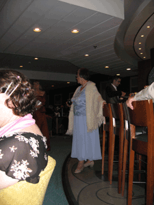 明後日の朝にはイギリスに着くという日のディナーの事。この日が最後のformal dinnerで仮面舞踏会♪翌日はイギリスに着く直前の日だから、スーツケースも早くに通路に放り出さないといけないしそれなりに忙しい……。で、この日が最後のメインイベント♪で、昼まっから他の乗客の人に「今日は面白い出し物があるから、夕食にカメラを持っていかないといけないよ。」って……。(ディナーメニューは写真に撮りたいのでカメラ必携♪ その心配は要らないのだけれど……) で、ディナーをラウンジで待つ人々…… みんな最後でちょっと気合入っている??ディナー会場♪ 一杯万国旗が飾られていて ひときわにぎやかしく…… で、いつものように私のチョイス♪ で、その食事の間にウエイターさんたちがごそごそ……何か準備している??? なんか、間合いを計ってる??? と思っていたら大音響の音楽とアナウンスメントとともに始まった!! (彼ら歩いているから写真がぼけるのよね……) デザート、花火を手にとっても誇らしげ デザートからものすごい勢いで花火が出ているけれど…… そのデザート食べるのもしかしたら私達??? まだやるか…… もうデザートの花火終わってるじゃない…… 花火持ってきて、サービスしなくってもいいから……で、必死に踊るマネジャー♪ (あんまし、必死に踊っているから、こっちは顔がぼけてしまった) で問題のデザートはこんなのでした…… さてこのとき、テーブルにあった の着画、ヘアースタイルについてはこのあと……