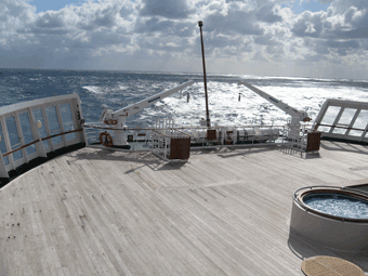 旅のお話の方も続けて早くポンペイ、等に案内しなくては……です。 ザキントスを夕刻出航した私達。出航後まもなくキャプテンの特別放送が入ります。海が荒れているし、波が高いためにパレルモの港に入稿するのは非常に危険場合によっては直接ナポリを目指すかもしれない……、と。翌朝にはパレルモに入港の予定だったのですが……。調度、このとき私達が乗っていたQE2を含めて三隻の豪華客船が航行していたそうでいずれも翌朝、パレルモ入港の予定がキャンセルになるだろう、とのことでした。そういえば既に船のゆれがきつくなっていて、船酔いを訴える人も……。運動神経はゼロにもかかわらず、三半規管はなぜか非常にタフな私……甲板に出てみると…… 穏やかなはずの地中海が激しくうねっています♪ で翌朝 こんな掲示が…… パレルモもある意味東西の十字路のような役割を果たしてきたところ…… 古い遺跡にも興味があったのだけれど、 天候のせいで近づけないのであれば仕方がない♪ 再び船内探索でもしますか…… これは写真ギャラリー 今までに乗船した有名人の写真が飾られているの♪ 例えば…… こちらは鉄の女性、と言われたお方では…… こちらはエリザベス女王のお母さんでは…… (自信ないけれど……) 彼女……名前が出てきそうで……来ない…… 彼も……なんか見覚えがあるんだけれど……何しろ40年の歴史、相当期間は 世界一の豪華客船だったわけで…… それなりの歴史もあって当然と言うところで…… ギャラリーには有名人写真ぎっしり♪ 船内の随所にもその歴史を物語るポスターや絵が飾られていて……