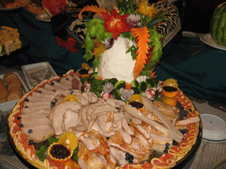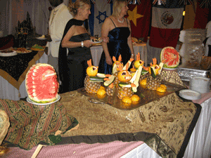 さて、二つ前のトピック……。踊るマネージャーの日はないとブッフェも無茶ゴージャスでした♪ (実はほとんどケーキばっかり……)あまっている食材使い切るのかな?などとうがった見方もしてみたりして……昼間の食事がかなり量があって、アフターヌーンティーのケーキたらふく食べて……状態なのでナイトブッフェは全く行かなかったのですが……この日、最初で最後のナイトブッフェに……。 でその写真…… (と言ってもケーキの写真ばっか……ですが) パイナップルで作ったウサギ……拡大すると…… これはズッキーニのギター(?)を持っています…… こっちはキーボード♪ みんな仮面パーティーの流れで来ているの服装はゴージャスです♪ こっちのウサギはまた違っているの…… そして、このウサギの背後に写っているカップル…… 男性ブラックタイに女性ブラックグラブの上から真珠のブレスなんだけれど…… お皿を手に必死で物色中♪ ウサギのお次はスイカの彫刻♪ (こちらはあんまし趣味が良くないかも……) 牛? で、いつまでも遊んでいないで本格的食べ物の方に…… と思ったら氷のディスプレイ忘れていた…… さてこの豪華なディスプレイの中にあった食べ物は…… 無茶豪華でした……。