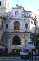 さて目的もなしにぶらぶらしててもしょうがないと……この教会の中に入ってみることにしました……。 この写真では小さくて見えないだろう、 天の飾りは…… こんなことをしていると、またまた引越しの憂き目を見るかも…… しかし懲りずに…… やっぱ詳しく書きすぎ……と思う?? 通路こんな感じ……叱られないかな?と恐る恐る…… 祭壇正面…… フラッシュ焚かないで撮ったのでかなり苦しいかも…… エレガントなシャンデリアに朱と金の対比がなんとも美しい♪ そして荘厳な天井画♪ 再度の壁にも一杯美しい装飾や絵画がかかっているのだけれど お祈りをささげている人が居たので、近づくのは…… 誰かのお墓? ……誰の?って聞かれても、すいません、知りませんって…… 頼りないことで…… さてソレントぶらぶらまだ続きます~。