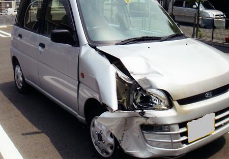 写真のプレオの凹み方は信号柱に突き刺さった形状が分かるでしょうか。