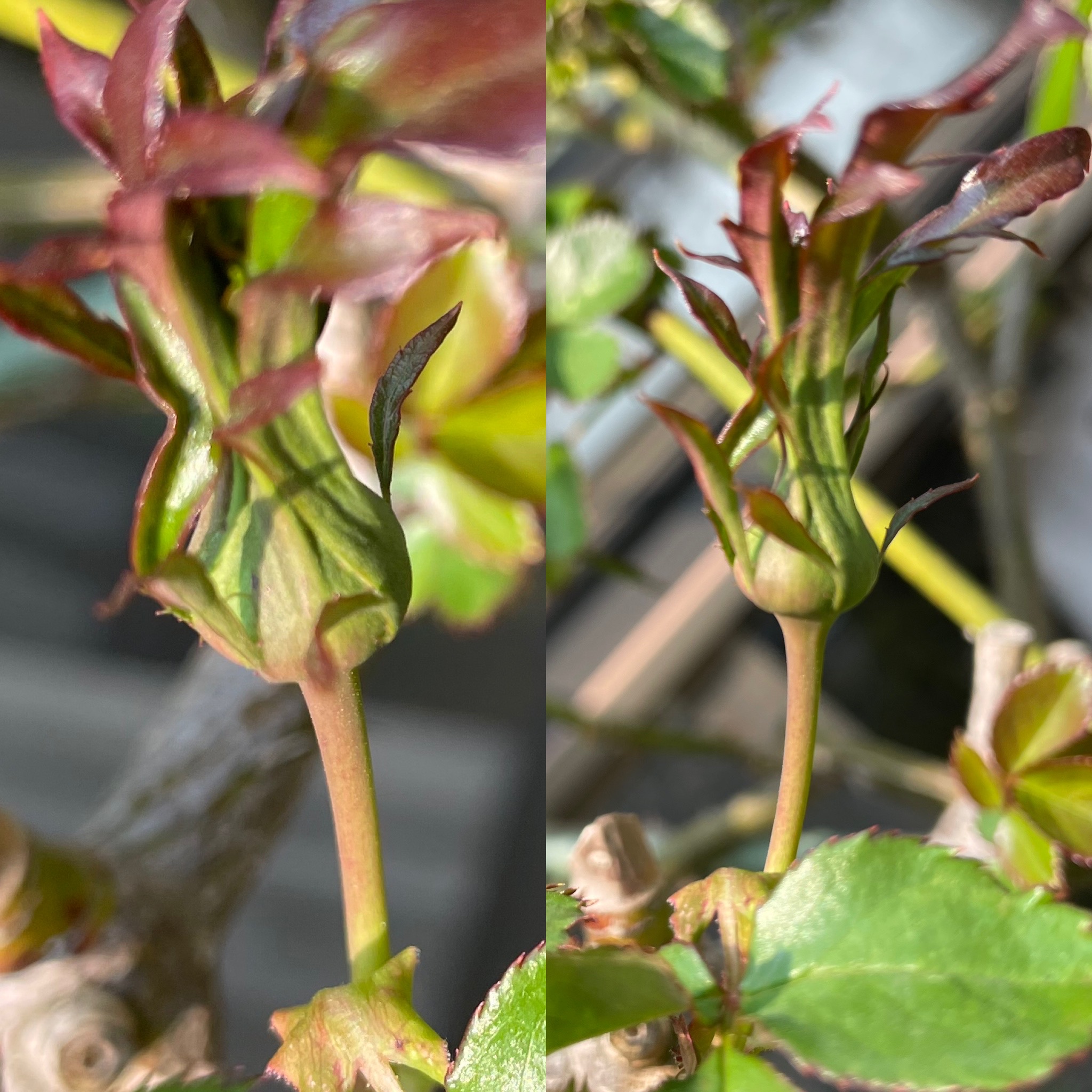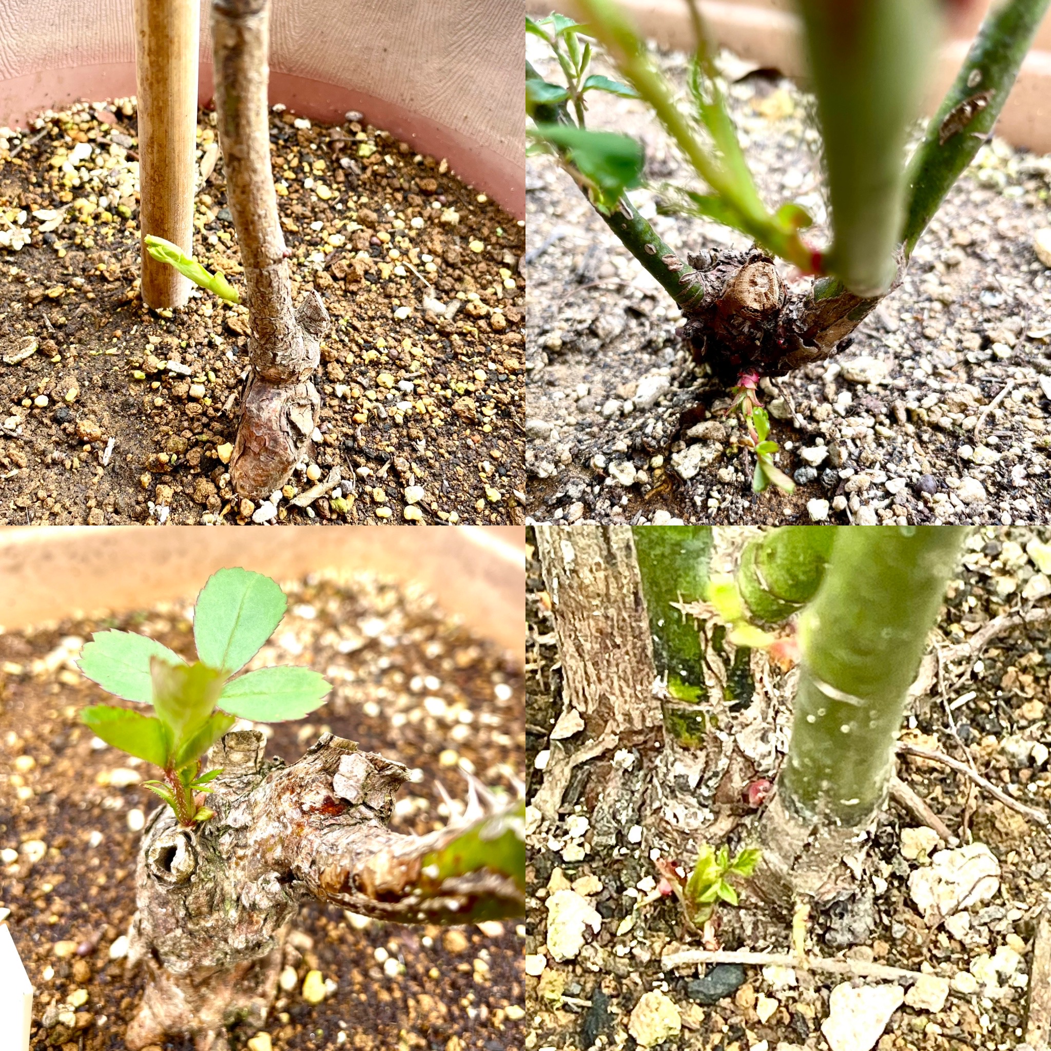 我が家の薔薇シュートが出て来た。新規の枝が出来て嬉しいです。鉢植えの株に出たシュート!シュートが出る事は株が元気な証!今年もたくさん咲いて欲しいです。地植えに出たシュート!主にツル薔薇です。親株の元からもシュートが出てる。青い幹は昨年伸びたシュートです。下段はツルを地中に埋め根を張らした株そこからも新芽が出て来たので嬉しいです。挿し木した枝!葉が大きく成長して来た!でもしっかり根が張ってるかは不明?このまま大きく成れば挿し木成功かな?ROOMにも遊び来て下さい。